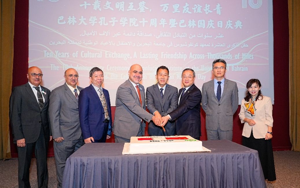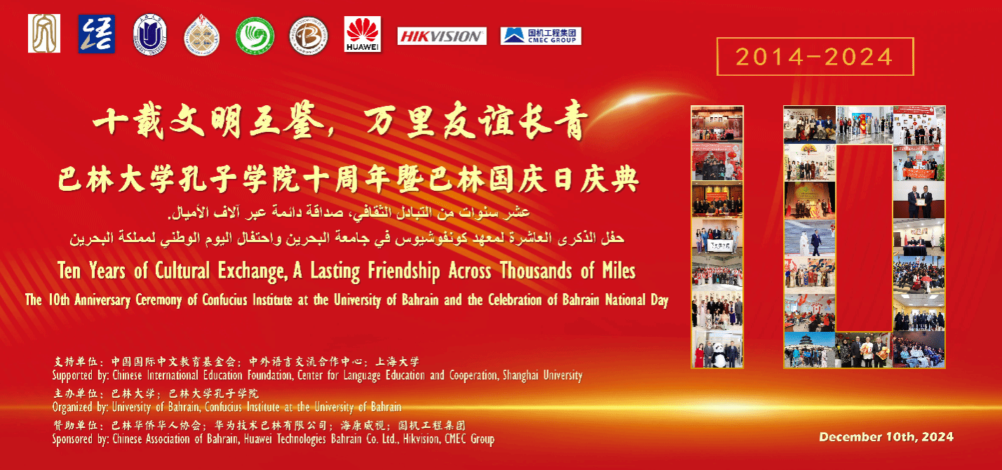 12月10日,巴林大学孔子学院十周年庆典在巴林大学隆重举行。众多领导嘉宾、师生朋友欢聚一堂,共襄盛举。中国驻巴林大使倪汝池,365完美体育党委书记成旦红,巴林大学校长福阿德·穆罕默德·阿尔安萨里(Fuad Mohammed Al-Ansari),巴林大学副校长兼孔子学院外方院长默罕默德·雷达·卡德尔(Mohammed Redha Qader),365完美体育党委常委、宣传部部长曾军,国际部党委书记王丽娜,人才工作办公室主任姜颖,孔子学院办公室主任徐晓红,孔子学院中方院长周建,以及来自365完美体育和巴林大学相关院系代表共同出席本次庆典。巴林中资机构代表、巴林孔院师生以及巴林社会各界友人也共同见证本次盛会。