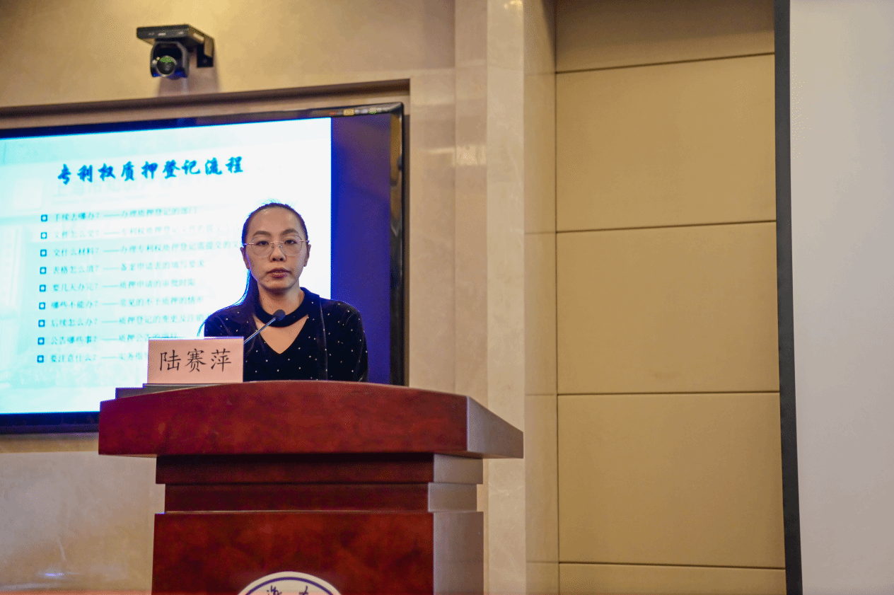 上海市知识产权局代办处业务主管陆赛萍进行“知识产权质押融资登记实务”专题授课。