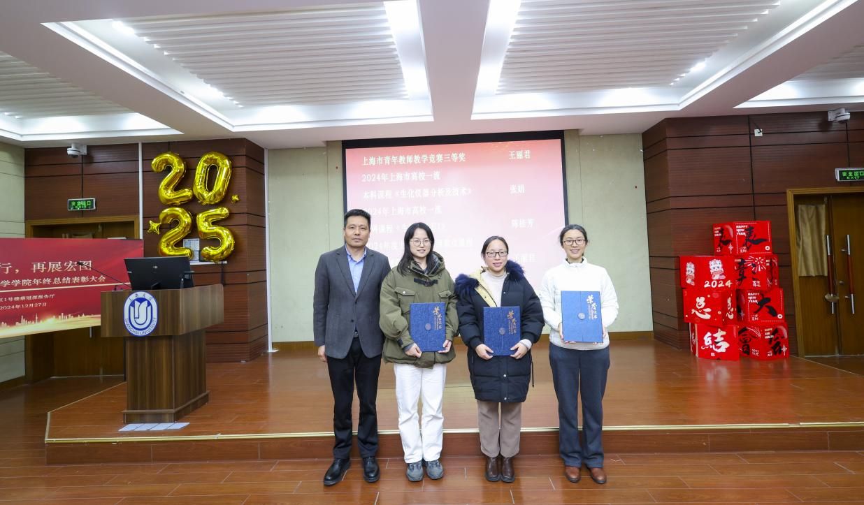 随后表彰了上海市青年教师教学竞赛三等奖获得者、2024年度上海高校市级重点课程(生物制药工艺学)主持人王丽君,2024年上海市高校一流本科课程(生化仪器分析及技术)主持人张娟,2024年上海市高校一流本科课程(生物化学E1)主持人陈桂芳。由校保密办主任陈付学为他们颁奖。
