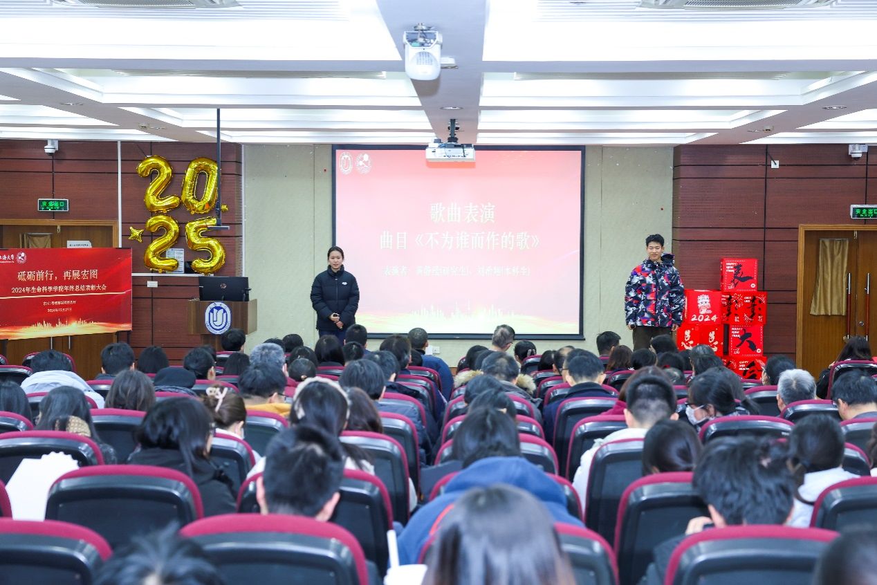 学院研究生黄静滢、本科生刘希翔为大会精心准备了歌曲节目《不为谁而作的歌》,以表达同学们对学院老师辛勤培育的感恩之情,也祝愿学院在新的一年能取得更加优异的成绩。