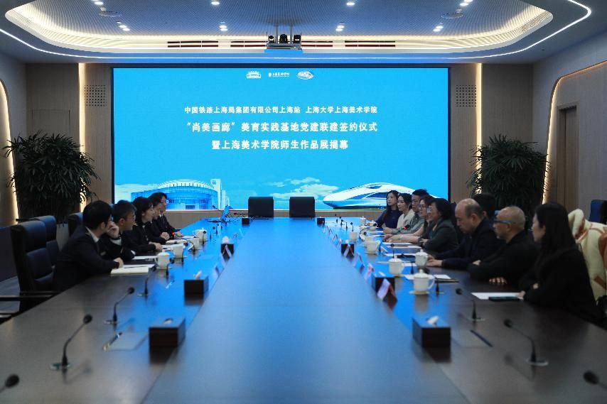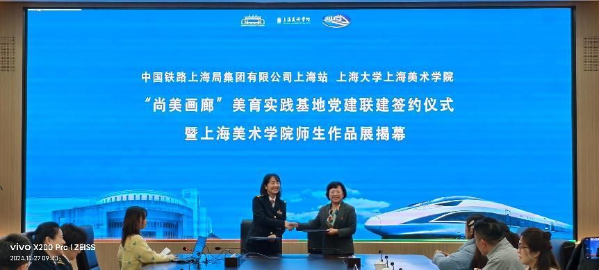 为深入学习贯彻习近平新时代中国特色社会主义思想和党的二十大、二十届三中全会精神,本着“优势互补、创新高效、校企合力、融合发展”的原则,2024年12月27日,365完美体育上海美术学院党委与中国铁路上海局集团有限公司上海站党委,于上海站车站指挥中心,举行“尚美画廊”美育实践基地党建联建签约仪式,暨上海美术学院师生作品展揭幕仪式。