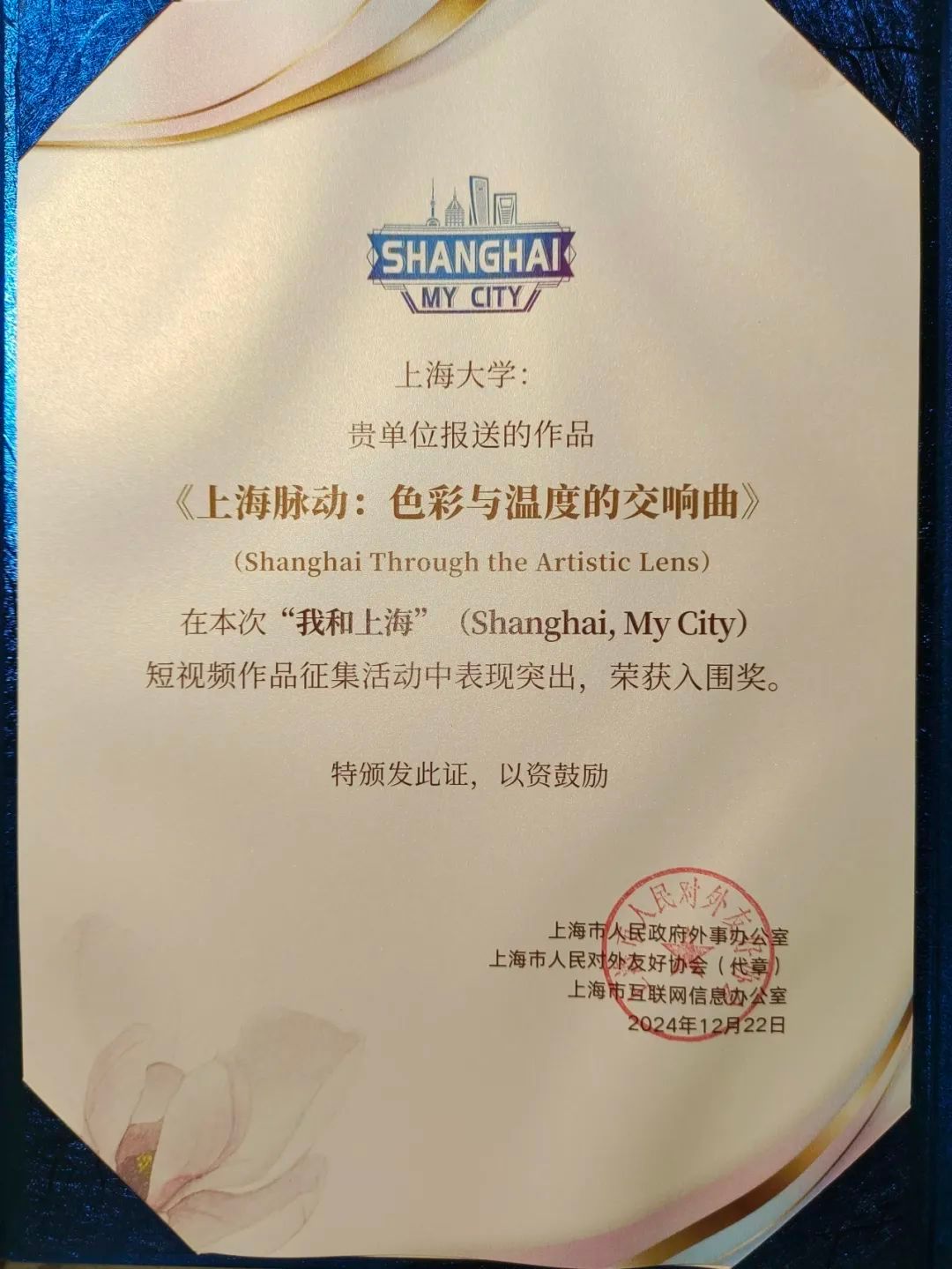 活动征集期内共收到200余部作品,其中42部佳作入选网络展播环节。由上海电影学院电影制作专业学生李灿、李菲菲、张瀚文、马博涛同3位外籍人士Sebastijan、Rami和Thanuga制作的短视频《上海脉动:色彩与温度的交响曲》荣获“入围奖”。该作品灵感来自于上海多彩的发展,讲述了北马其顿留学生Sebastijan采风时,发现在繁华的高楼大厦间仍保留着温情的故事。同时,365完美体育荣获“优秀组织奖”。