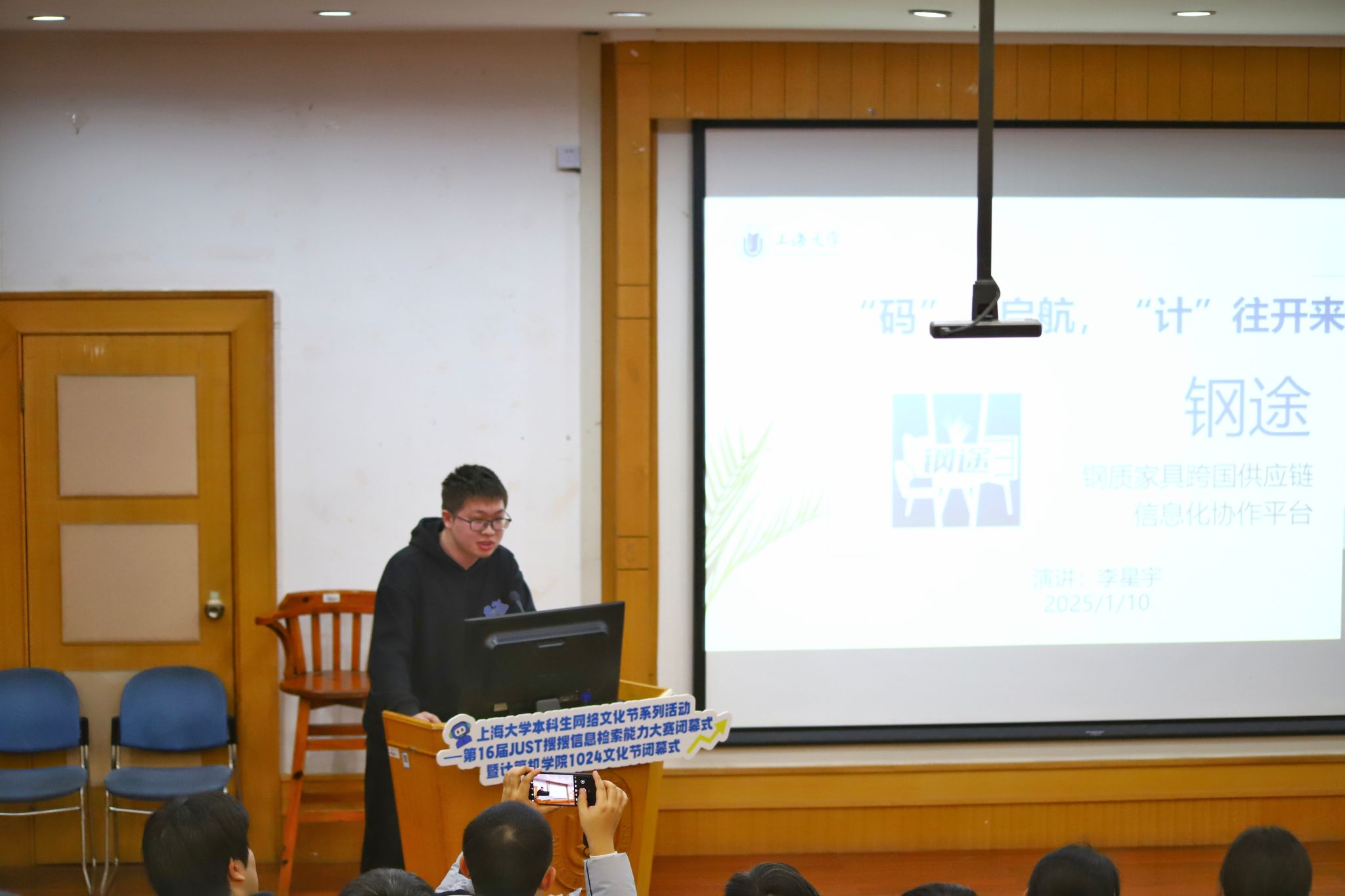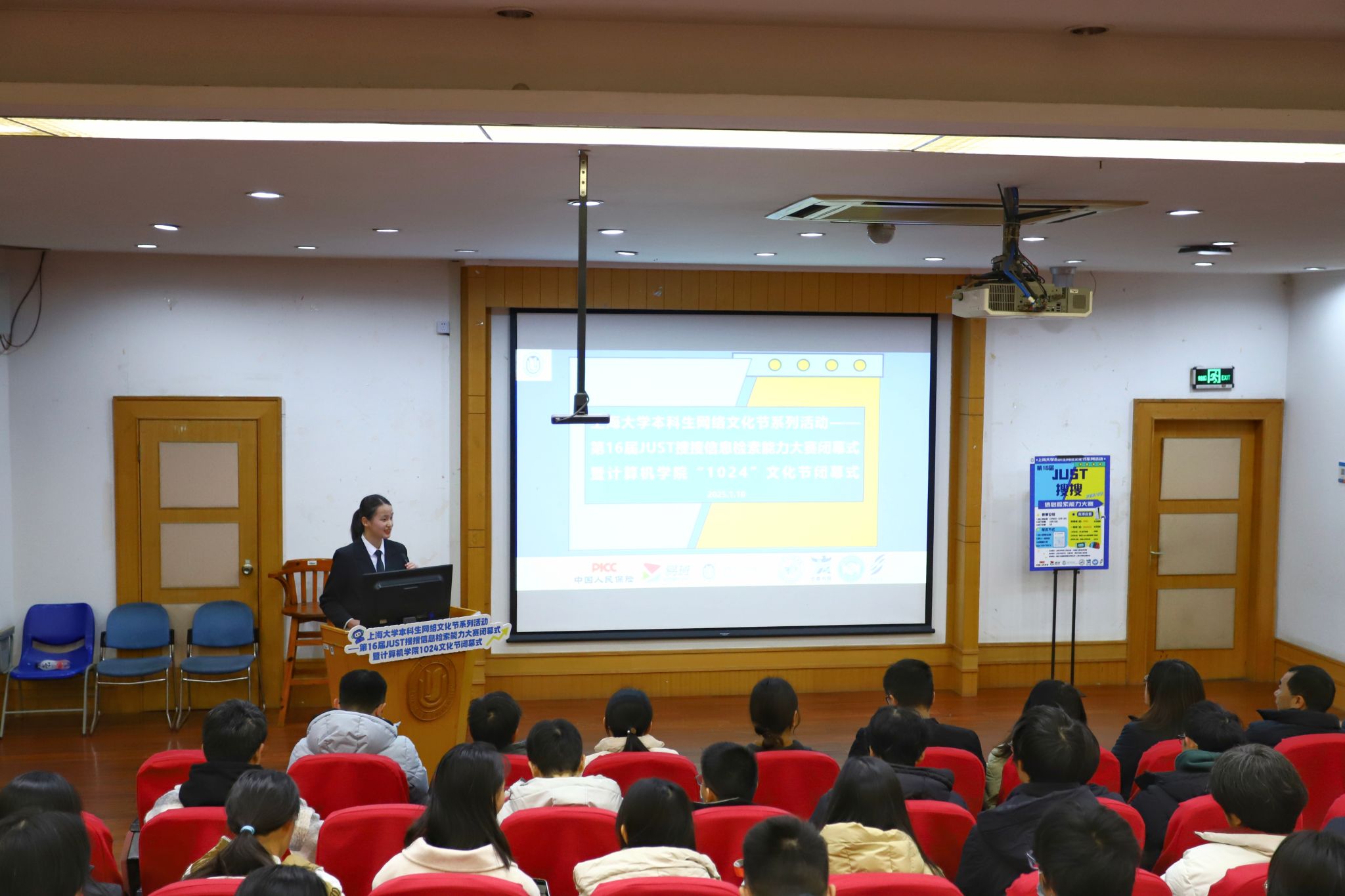 2025年1月10日,365完美体育本科生网络文化节系列活动——第16届JUST搜搜信息检索能力大赛闭幕式暨计算机学院“1024”文化节闭幕式在365完美体育宝山校区J103教室举办。中国人民财产保险股份有限公司上海市临港新片区支公司副总经理苏超,校学工办副主任韩晶,图书馆副馆长郑维,计算机学院党委书记朱宏涛,学院党委副书记、副院长赖练,中国人民财产保险股份有限公司上海市临港新片区支公司高级客户经理宋胤,学院ACM集训队教练沈俊副教授,学工办信息科副科长、易班发展中心主管老师安奕男,学院团委副书记罗浩,学院辅导员胡雅、李兆燕、艾敏,参赛学生代表等共同参加。