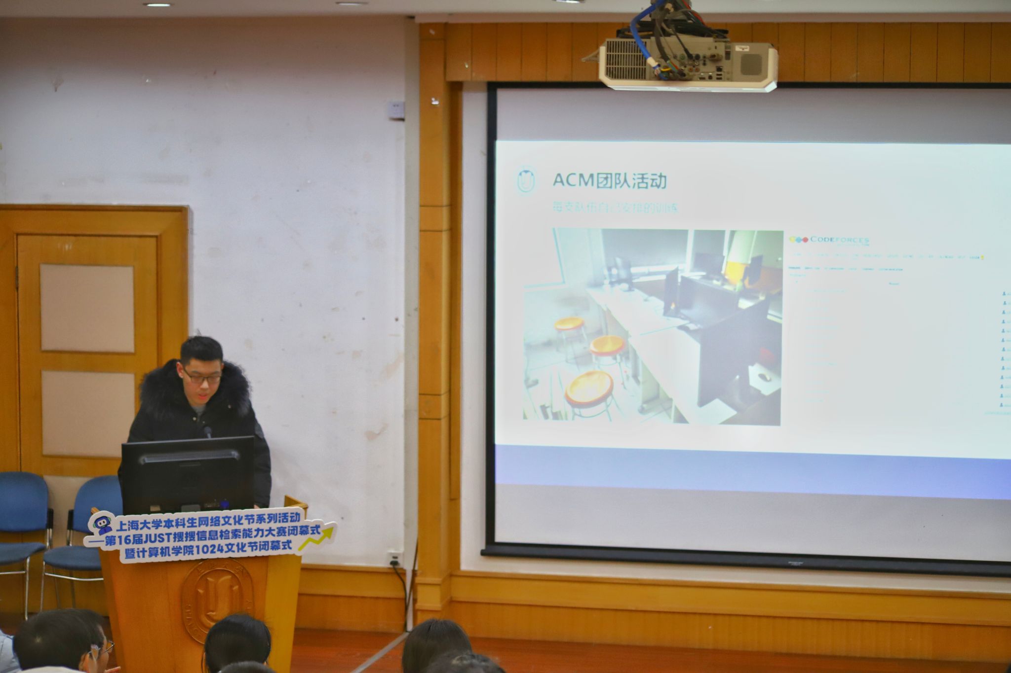 活动特别邀请了计算机学院专业教师、ACM集训队教练沈俊副教授介绍了ICPC赛事相关情况。作为本届1024文化节的重要元素之一——ICPC,这项在全球范围内享有盛誉的计算机程序设计竞赛,无疑是技术深度、智慧火花与团队协作精神的完美融合与综合展现。通过沈老师幽默风趣的介绍,同学们在了解我校参与ICPC的悠久历史和卓越成绩的同时,也充分树立信心,期待利用假期时间“刷题充电”。