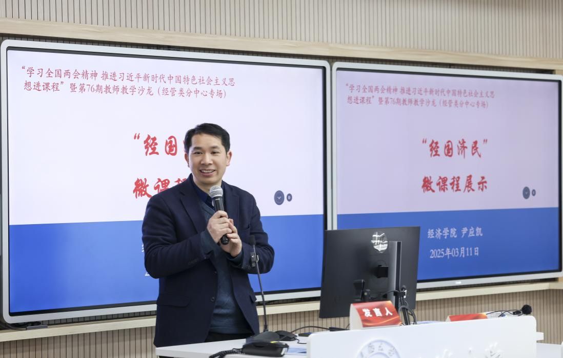 上海市课程思政教学名师、经济学院党委书记尹应凯谈了他对两会最新精神的关注点。他以国家一流课程“经国济民”为例,分享了经济学院将课程思政融入课堂教学的具体实践。他指出,课程思政要紧密结合社会热点和专业特点,如将全国两会热点词融入课程,通过案例分析、热点讨论等方式,引导学生关注国家发展,培养学生的经济责任感和家国情怀。他还表示,经济学院党委高度重视两会精神贯彻到课程、专业和学科建设中,要以“五五规划”为主线,建强课程思政领航学院,推进课程思政“五进”,即进课堂、进课外、进教材、进科研、进实践。