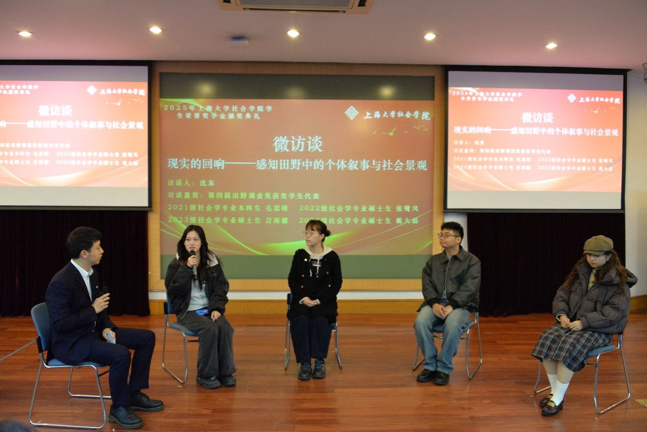 为进一步加深同学们对田野调查的理解和认识,主持人沈东老师与田野调查奖获奖学生代表进行了以“现实的回响——感知田野中的个体叙事与社会景观”为主题的微访谈。