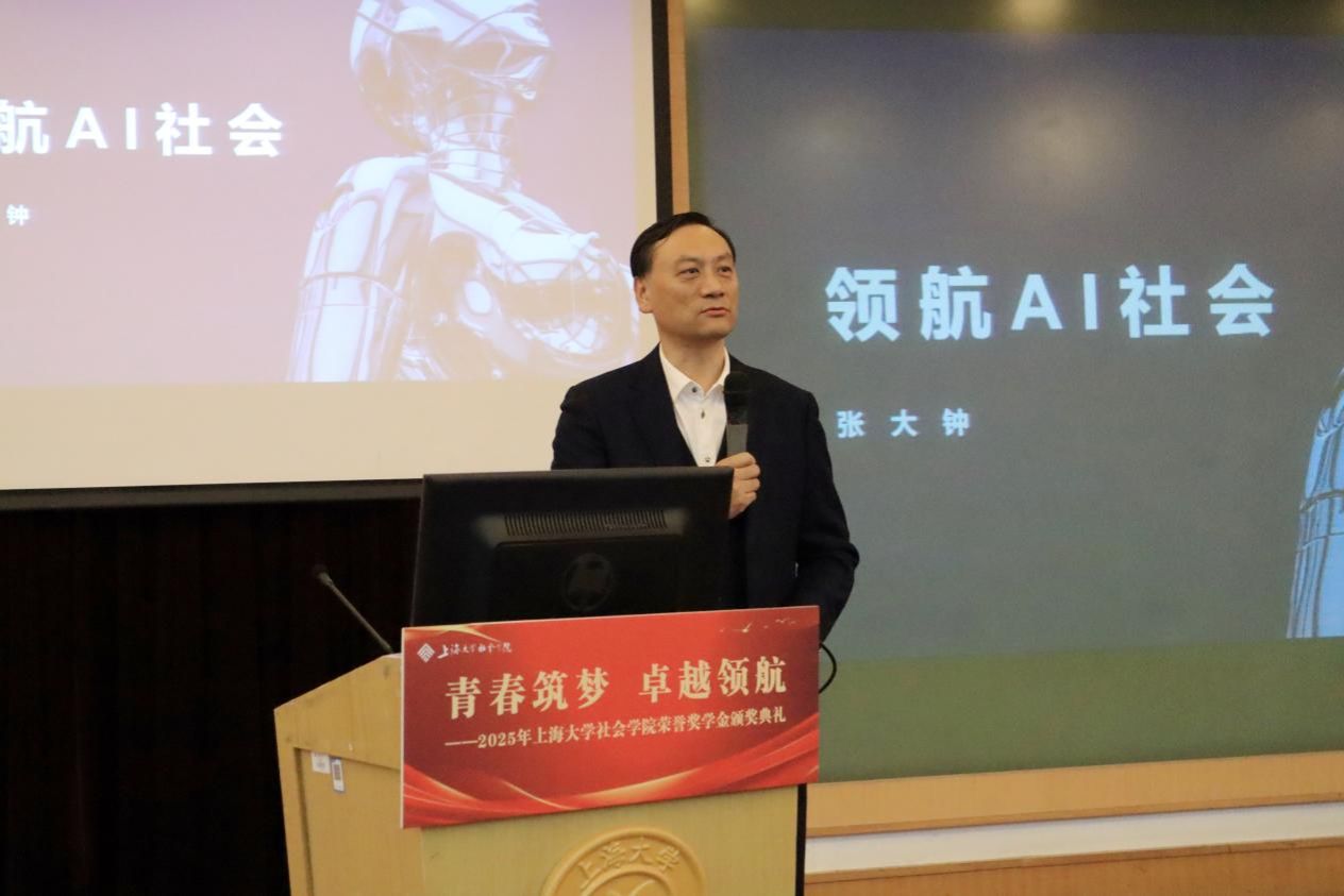 聘任仪式后进入魁阁讲堂,张大钟校友为在座同学作题目为《领航AI社会》的主题讲座,他结合自身经验,探讨了AI时代下社会学领导力的培养,提出社会学人在数字社会中需要具备持续学习的素养、社会学想象力的修养、构建集体意义的涵养,并鼓励同学们培养“好奇心”“好胜心”“好开心”,成为AI社会的领导者。张大钟校友的讲座启发同学们思考AI如何重塑社会关系,以及社会学人在其中的责任。他强调,社会学的使命是揭示被忽视的社会现象,在技术主导的时代,学者应保持批判视角,避免陷入算法控制的思维陷阱。社会学人需具备洞察力和思辨力,以理解新型社会秩序的运行逻辑。他鼓励同学们深入实践,以真实体验为基础,发现问题本质,寻找有效路径,让社会学类专业在AI时代发挥应有的影响力。