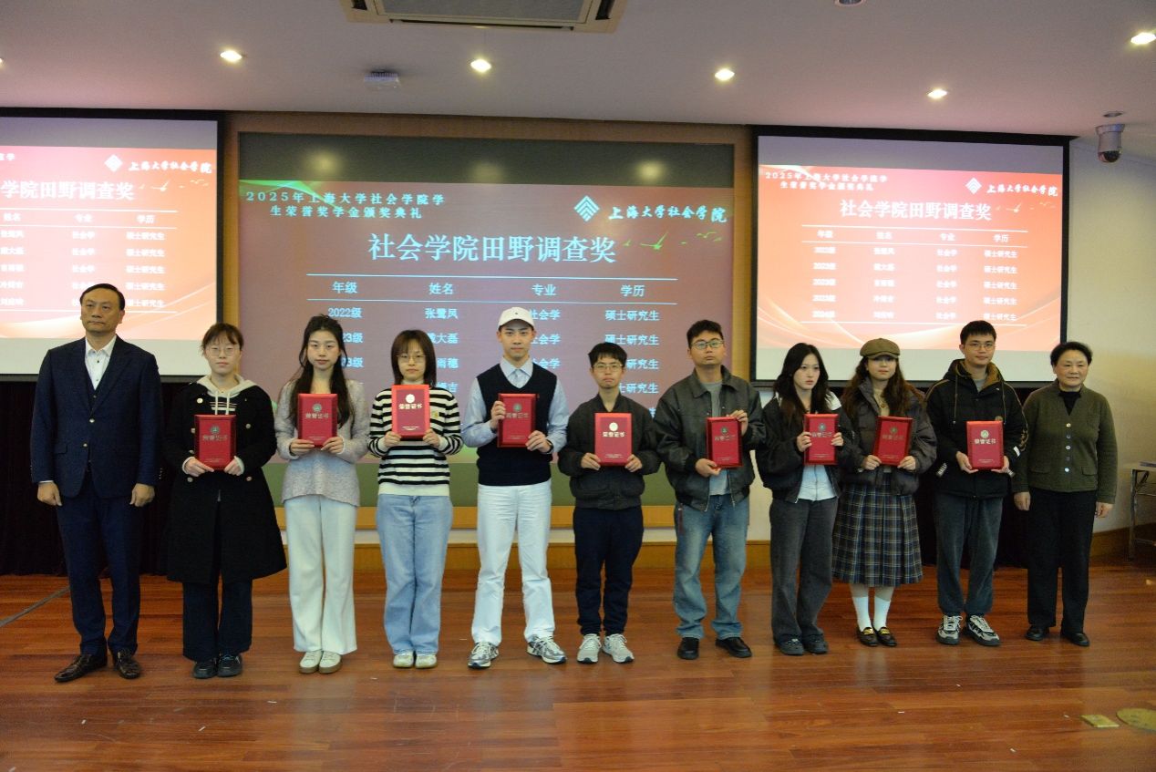 李友梅老师、张大钟校董为毛思晴、张诗若、顾思泽等10位同学颁发社会学院田野调查奖。