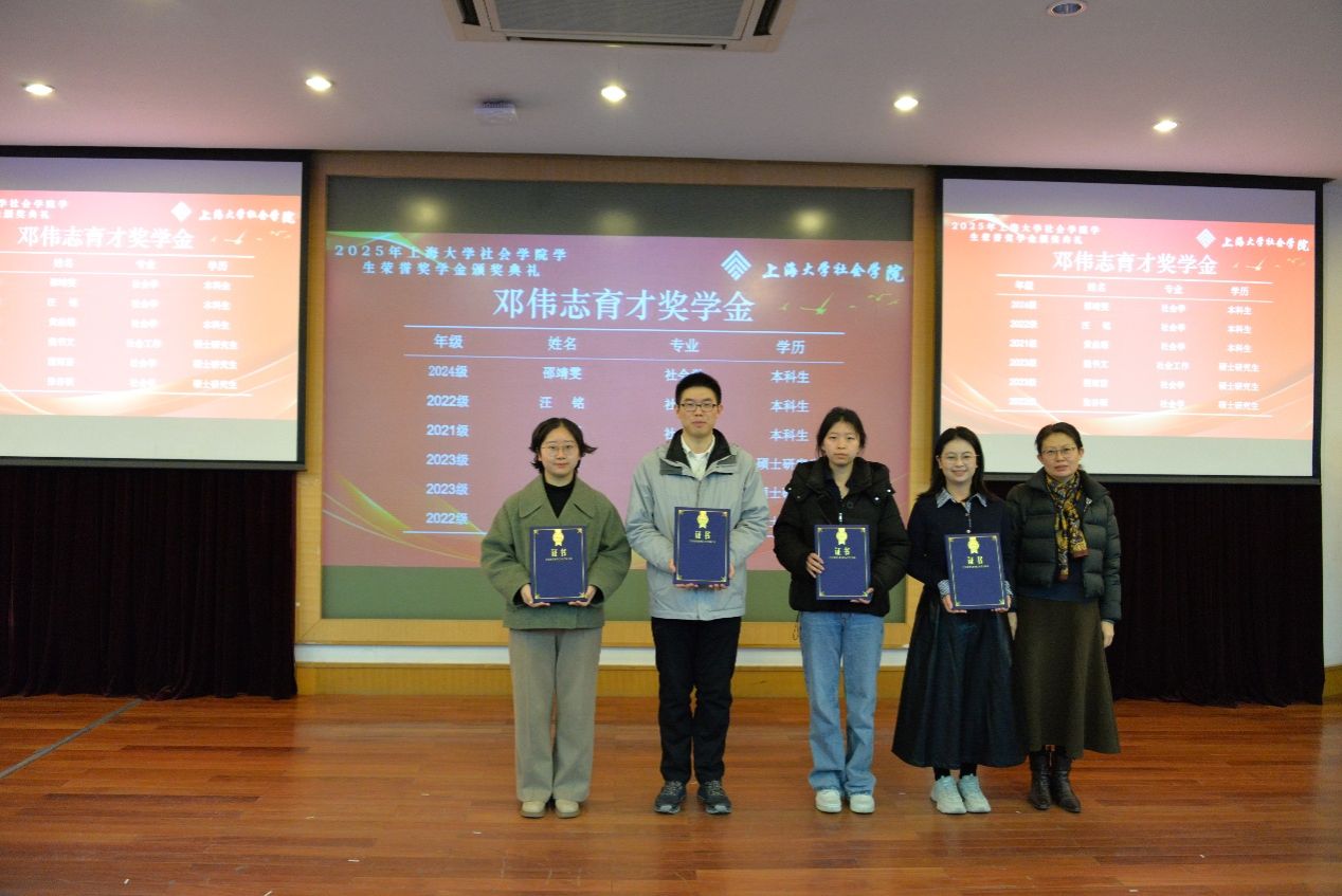 韩晶老师为邵靖雯、汪铭、黄焱堰等6位同学颁发邓伟志育才奖学金证书。