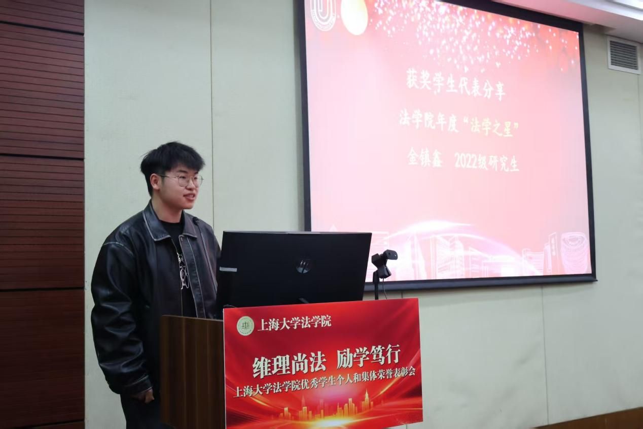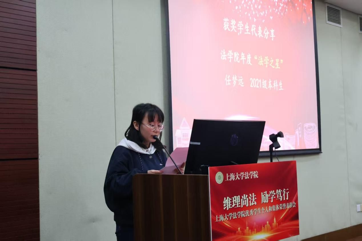 颁奖仪式结束后,两位法学院年度“法学之星”上台分享自身感悟。法学院2021级本科生任梦远向一直以来辛勤付出的老师们以及共同成长的同学们表示最衷心的感谢,同时也感谢法学院为大家提供的相当多的平台与机会。她回顾了本科参加的许多比赛与学术论坛,鼓励大家不要只着眼于眼前利益,应该勇于应对挑战,说不定会获得新的机遇,并在最后用“取法乎上,得乎其中;取法乎中,得乎其下”与大家共勉。