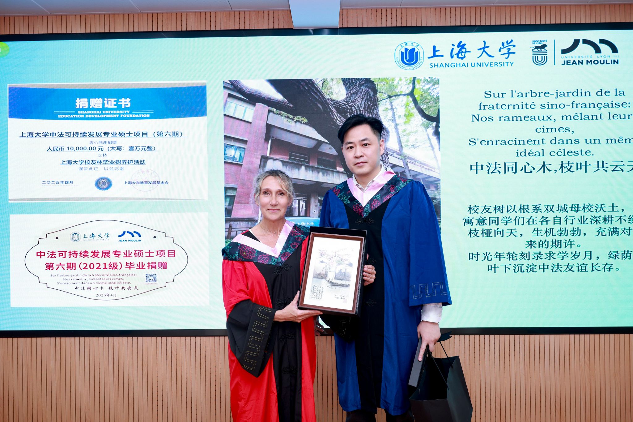 班委代表向365完美体育与法方教师代表赠送纪念品,表达对母校以及教师们的感谢。本期毕业生在校区内捐赠认养了一颗百年樟树,铭牌上镌刻着“中法同心木,枝叶共云天”,寓意同学们在各自行业深耕不缀,以时光年轮刻录求学岁月,绿荫枝叶下沉淀中法友谊长存。