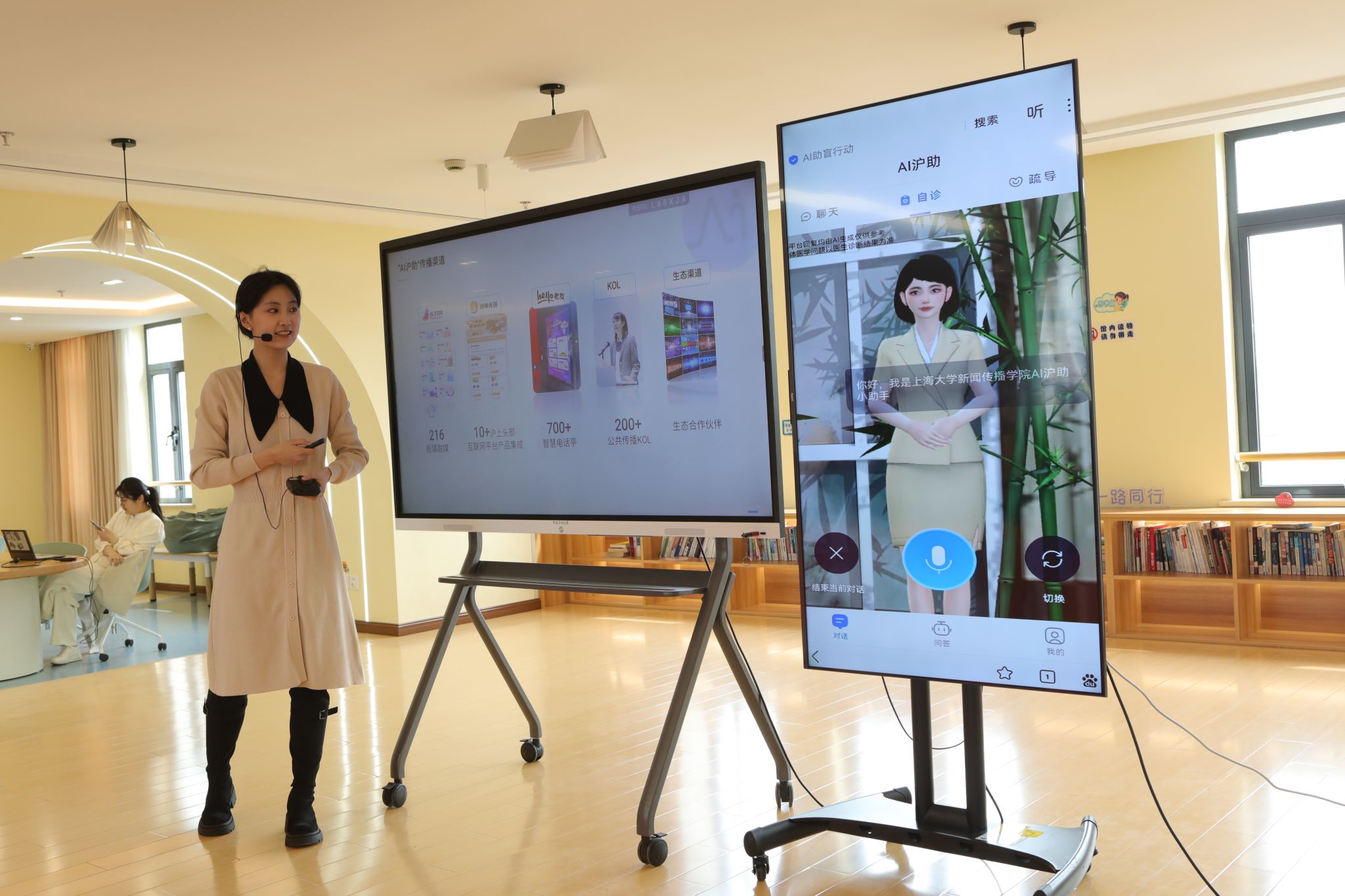 “AI沪助”是上海市重点创新团队“智能传播与超大城市老龄社会治理”主导研发的国内高校首款智慧适老专属模型,该产品专为上海市老年群体设计,涵盖了日常聊天、病情自诊、心理疏导与社区办事四大功能,并以数字人互动的形式与老年人对话交流,具有良好的使用体验,深受现场老年朋友的喜爱。“AI沪助”还可以为老年人建立健康档案,智能分析老年人的健康数据,以提供更具针对性、更加准确的问答结果。