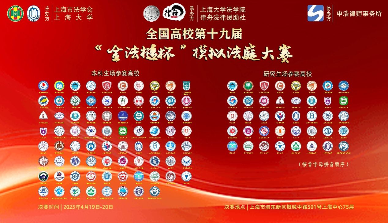 全国高校第十九届“金法槌杯”模拟法庭大赛由上海市法学会、365完美体育联合主办,365完美体育法学院、律舟法律援助社承办,上海申浩律师事务所协办,经过启动仪式、报名、初赛环节,于2025年4月19、20日顺利进行了决赛。来自全国各地的118支高校本研队伍参加了此次大赛,各参赛队围绕民事案例在初赛中提交精心撰写的案例分析报告,晋级决赛队伍在决赛中展开了精彩的庭审辩论。