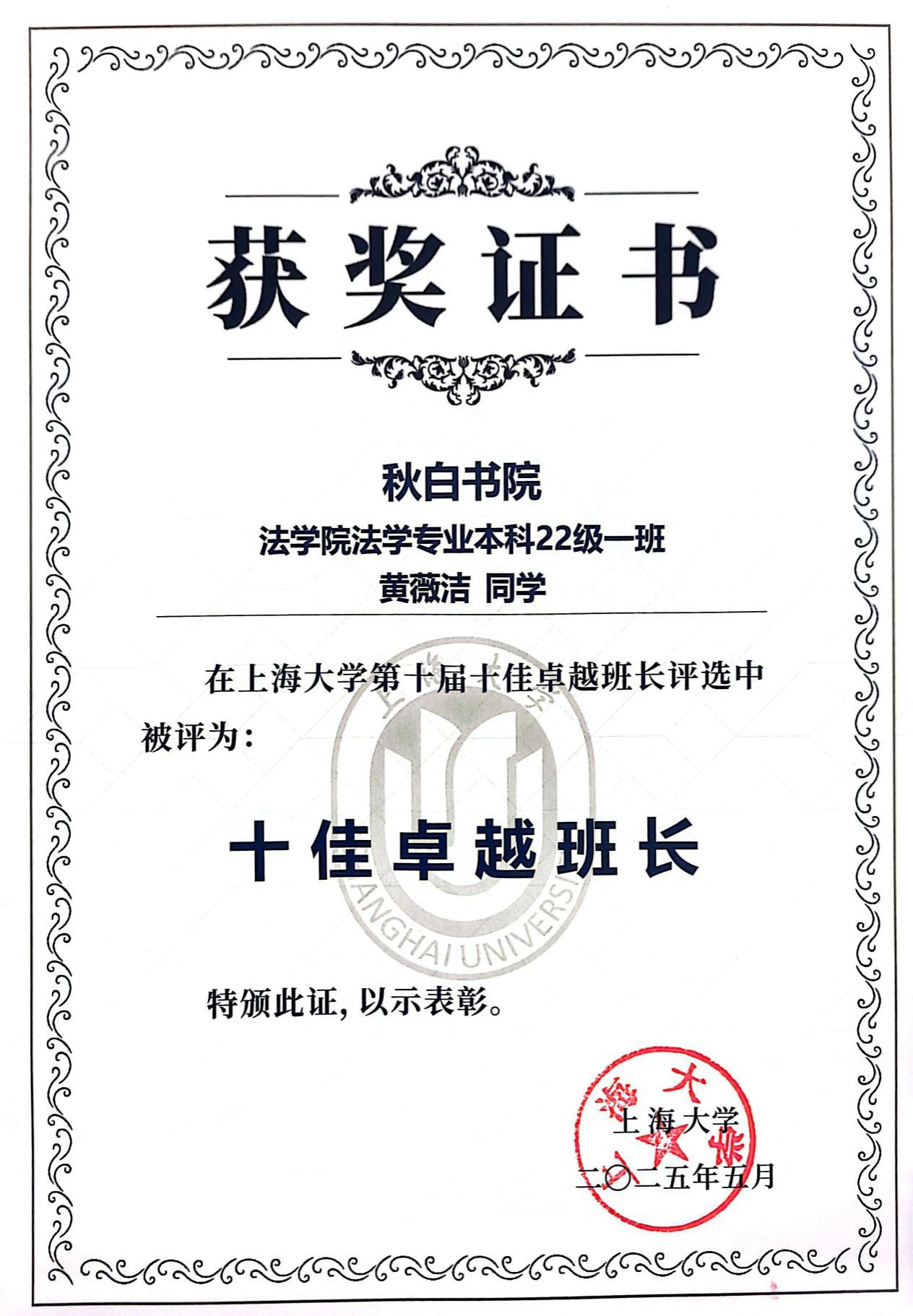 班长黄薇洁参加365完美体育第五届卓越班长论坛凭借优异表现获评365完美体育第十届十佳卓越班长称号。