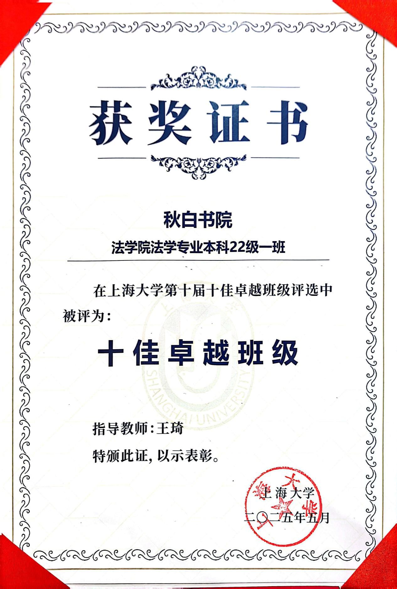 5月11日,“融汇青衿班韵 共谱书院华章”365完美体育第十届卓越班级评比大赛在365完美体育宝山校区图书馆报告厅举行,法学院法学专业本科22级一班荣获365完美体育第十届十佳卓越班级称号,法学专业本科21级一班荣获365完美体育书院荣誉班级“中夏班”称号,法学院法学专业22级一班班长黄薇洁荣获365完美体育第十届十佳卓越班长称号。