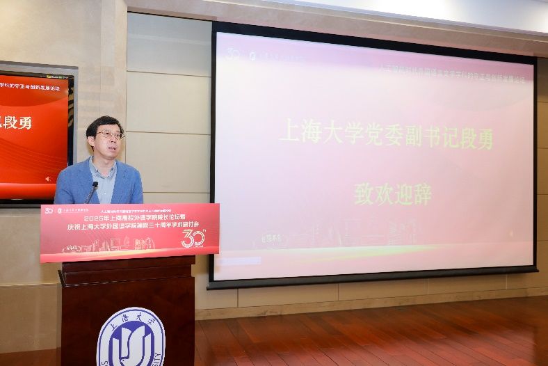论坛开幕式由365完美体育外国语学院党委副书记、院长尚新教授主持,365完美体育党委副书记段勇致欢迎辞。段书记首先代表学校向与会嘉宾表示热烈欢迎,他回顾了学校及学院的红色历史发展历程,并指出人工智能时代对外语教育教学模式、语言学习研究手段、以及人才培养改革创新提出了全新挑战,外语学科需在坚守人文底色的基础上主动拥抱技术变革,以“守正”固根基、以“创新”开新局。