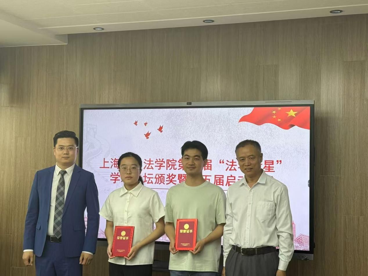在颁奖环节,上海铸达律师事务所主任张志超、青工委副主任董晟忻、蔡峥宇、365完美体育法学院党委副书记、院长李凤章分别为第四届“法学新星”学术论坛获奖同学颁奖。