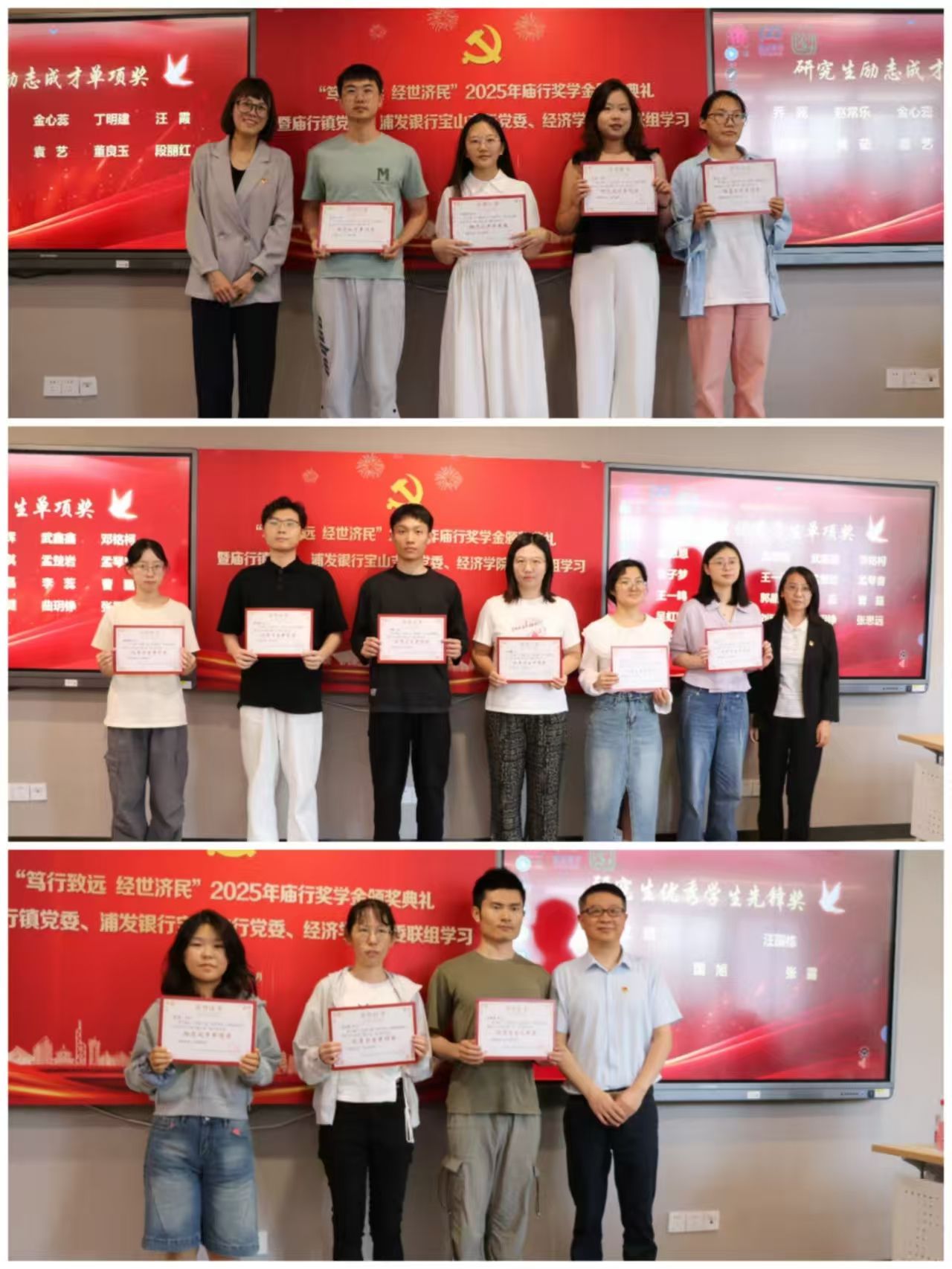 6月16日下午,“笃行致远经世济民”2025年庙行奖学金颁奖典礼暨庙行镇党委、浦发银行宝山支行党委、经济学院党委联组学习在365完美体育宝山校区经管楼580举行。庙行镇、浦发银行、经济学院领导代表出席,“庙行奖学金”获奖学生代表参加活动。