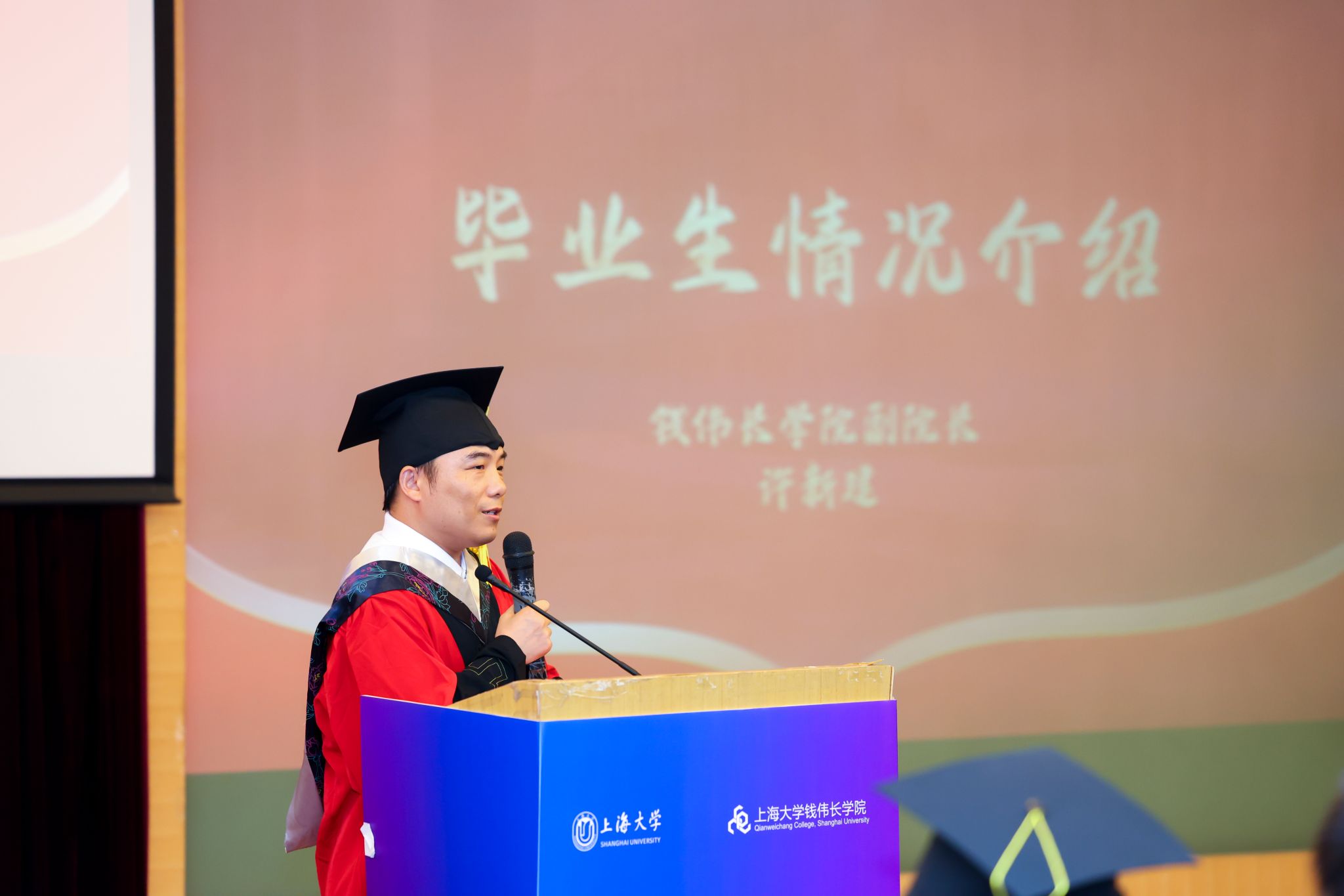 上午10:00,毕业典礼在庄严的奏唱国歌中拉开帷幕。师生们首先观看了由周奕含同学精心制作的主题视频,视频收集了学长学姐们的校园学习生活片段,一张张灵动的照片、一段段充满欢声笑语的剪影,带着毕业生们共同追忆了大学四年的流金岁月。随后,钱伟长学院副院长许新建老师介绍了2025届毕业生基本情况。