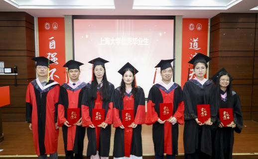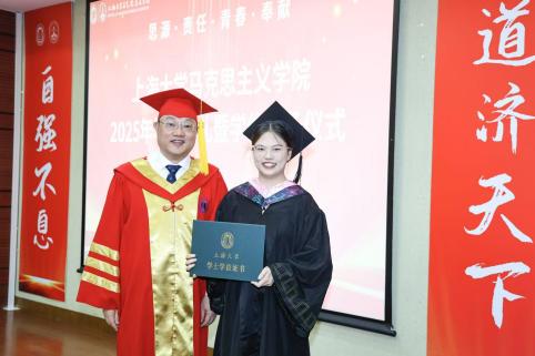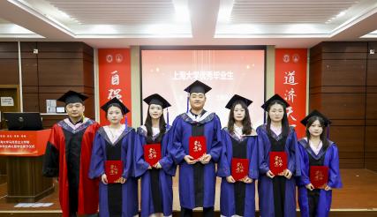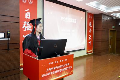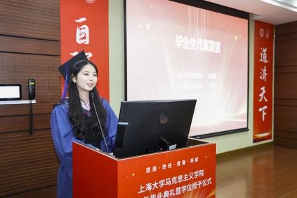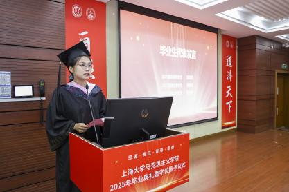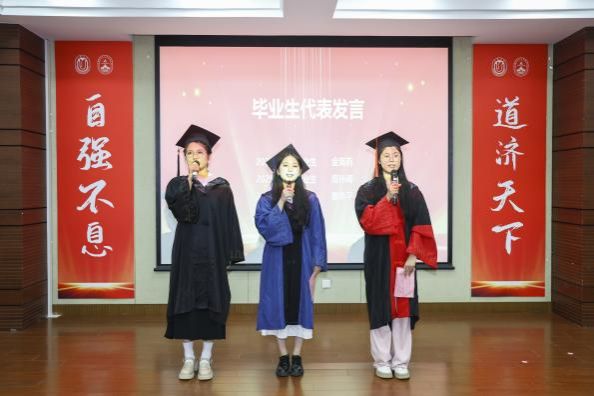 金海莉、周孙卿、魏艳平分别作为本科、硕士、博士毕业生代表依次上台发言。她们回顾自己在上大校园的成长经历,分享在学术探索旅途中的收获与感悟,同时也表达了对母校母院、师长和同学的感激和依依惜别之情。发言最后,三人齐诵李大钊先生的名言“以青春之我,创建青春之家庭,青春之国家,青春之民族,青春之人类,青春之地球,青春之宇宙,资以乐其无涯之生。”呼吁毕业生学子们铭记母校教诲,将青春融入时代征程,在实现中华民族伟大复兴的道路上奋勇当先,书写属于自己的精彩篇章。
