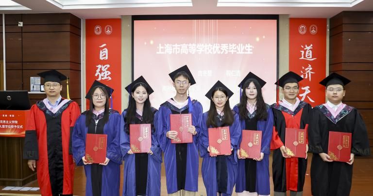 学院党委书记王国建为上海市优秀毕业生贺敏、吉冬慧、周孙卿、程仁浩、李嘉欣、吴家琪、韩春雨颁发证书。