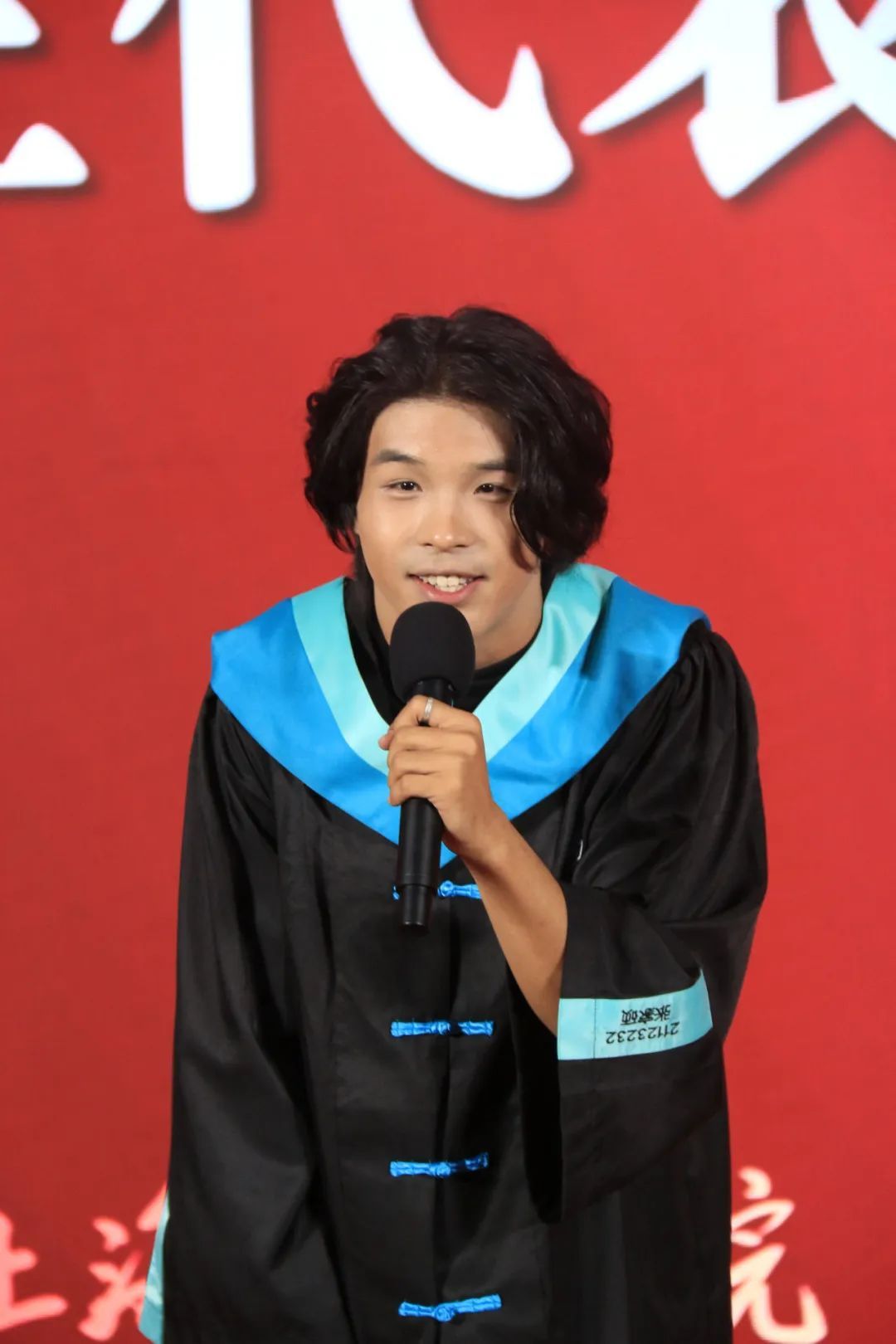 教师代表、上海电影学院教授、博士生导师任华东登台致辞。他以学者风范和育人情怀,向毕业生们传递了师长的殷切期望。任老师表示,教育不仅是技艺的传授,更是精神的传承;希望同学们在未来的艺术创作中,既要追求专业的精进,更要坚守艺术的良知,用光影书写时代,用作品温暖人心。