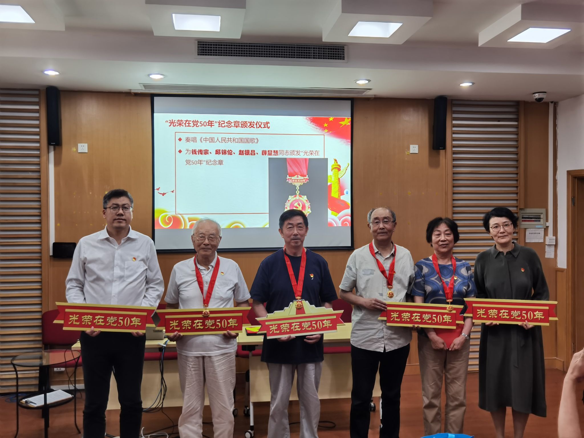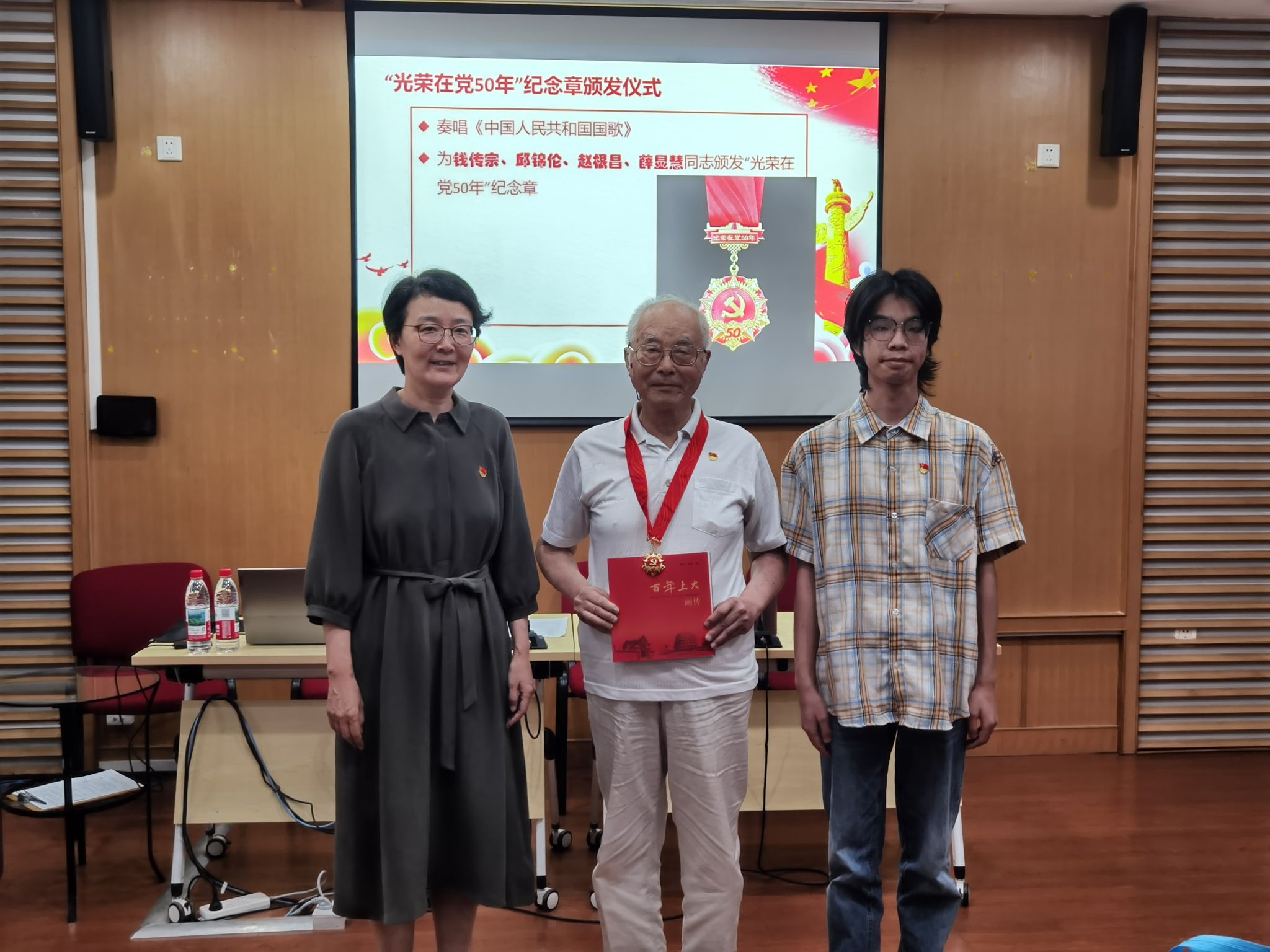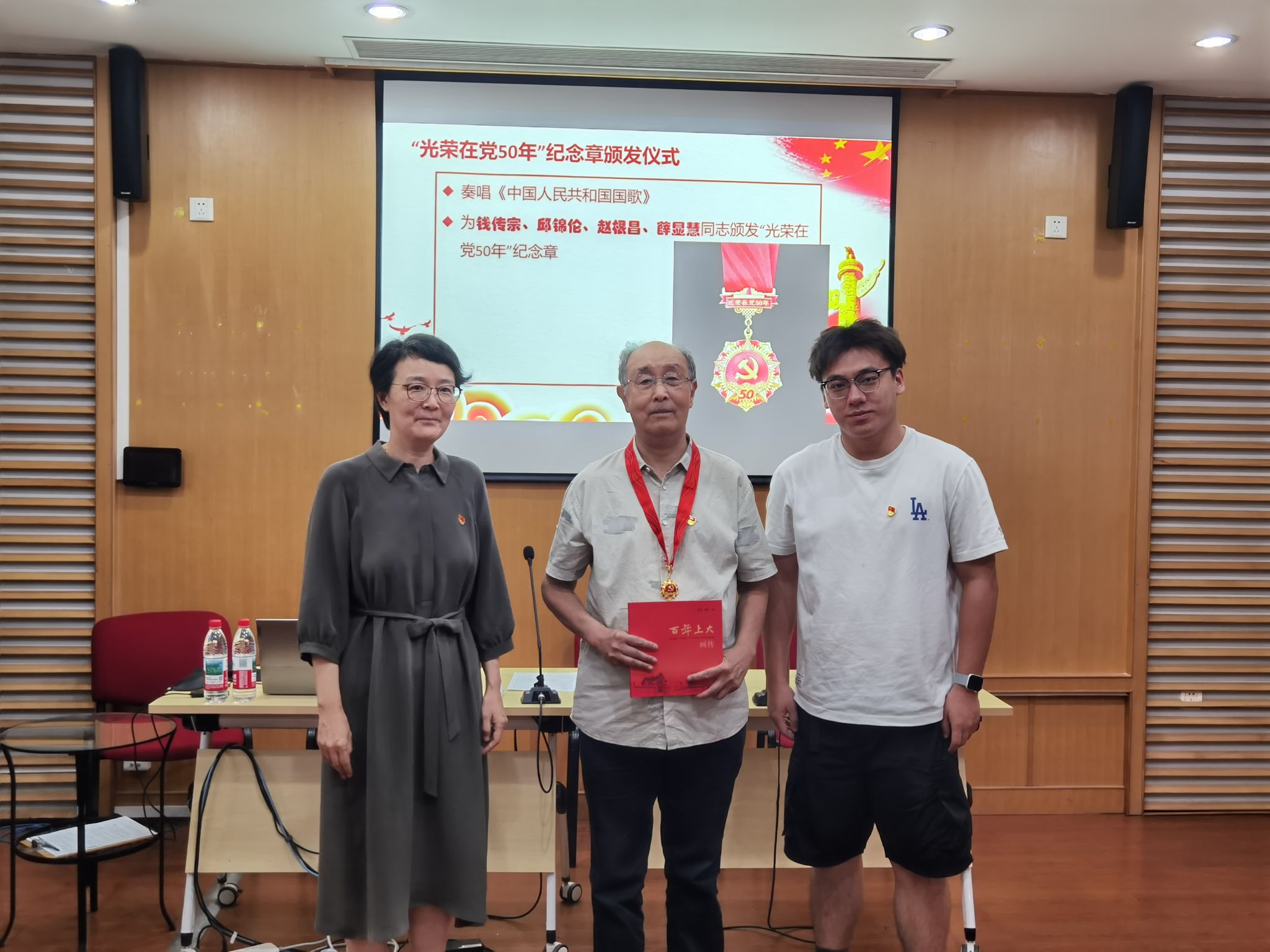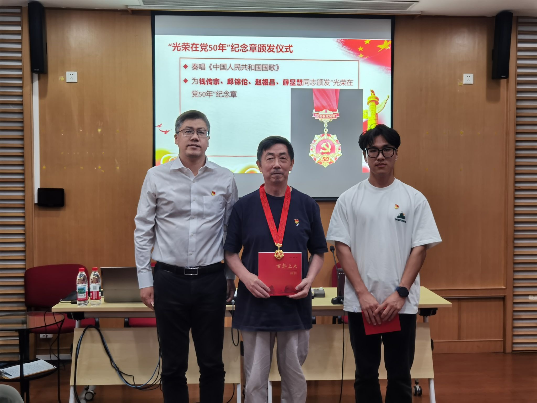 会议伊始,“光荣在党50年”纪念章颁发环节在庄严的国歌声中举行。离退休党委副书记林桦、学院党委书记朱宏涛分别为钱传宗、邱锦伦、赵根昌、薛显慧四位老党员颁发“光荣在党50年”纪念章,博士生党支部书记向老党员赠送百年上大画册,并向老党员致以热烈的祝贺和崇高的敬意。50年党龄,50载光荣,一枚枚沉甸甸的纪念章,承载着党中央对老党员矢志不渝、忠诚奉献的高度肯定,铭刻着他们为共产主义事业奋斗终生的坚定信仰和光辉足迹。