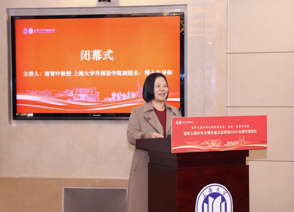 闭幕式由外国语学院副院长唐青叶教授主持。上海外语教育出版社社长助理高云松先生代表协办单位致辞。高老师结合自身听会体会,从编辑出版的专业视角提出三点建设性意见。首先,聚焦项目特色,项目应紧扣“上海”与“文明交流互鉴”两个关键词,立足上海本土实践,系统呈现文明互鉴在中国语境中的落地形态与实现路径。其次,注重传播转化,在从学术研究转向内容出版的过程中,需充分考虑读者的阅读习惯与精神需求,以大众熟悉的话题切入,实现学术成果的有效传播。尤其在使用境外材料时,应秉持批判态度,审慎核实史料的权威性与可靠性,例如上海红色记忆的书写必须建立在扎实的党史研究基础之上。最后,强调整合出版,在专题研究的基础上,应着力打破各专题间的壁垒,增强内容的系统性与整体性,实现从单一研究到有机出版体系的跨越。