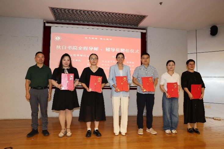 在书院全程导师及辅导员聘任仪式上,秋白书院院长肖瑛为马克思主义学院张艳芬、法学院崔浩然、社会学院张雪三位全程导师代表以及黄丽娜、公建华、薛赛男三位书院辅导员颁发聘书,希望书院的老师们成为学生成长道路上的陪伴者与引路人。