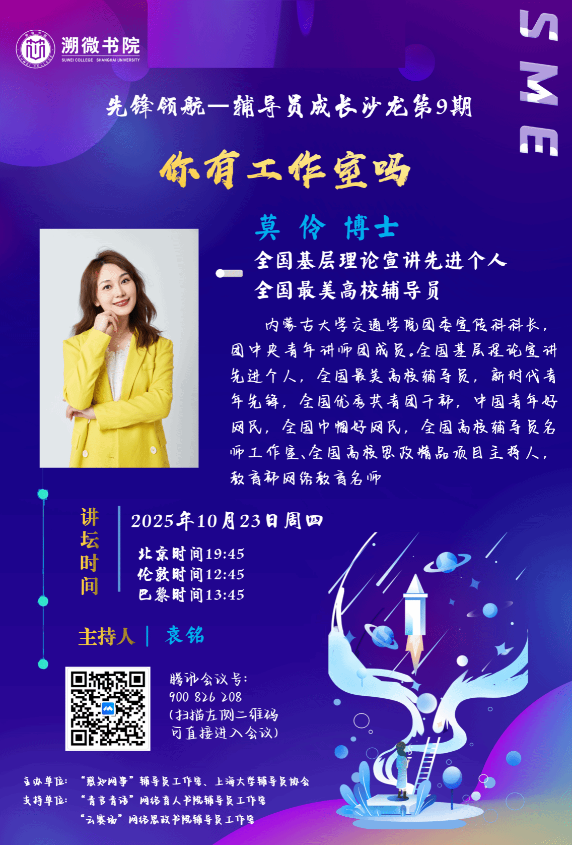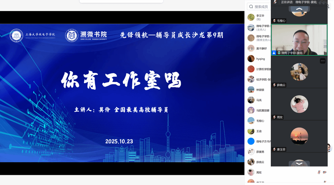 10月23日,溯微书院先锋领航辅导员成长沙龙第9期顺利举行。此次沙龙邀请全国最美高校辅导员、内蒙古大学莫伶博士担任主讲嘉宾。感知网事辅导员工作室负责人袁铭主持沙龙,管理学院党委副书记、副院长马亮,计算机学院党委副书记、副院长赖练,以及辅导员协会和相关院系辅导员参加了此次沙龙。