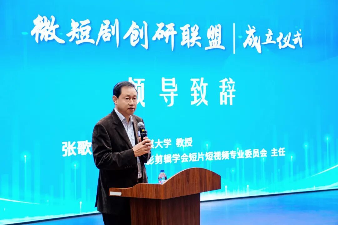 中国传媒大学教授、中国电影剪辑学会短片短视频专业委员会主任、中国电视艺术家协会网络视听艺术创作委员会副会长张歌东从技艺融合的角度肯定了联盟成立的重要意义。他指出,“短视频艺术”正在逐渐形成独立的美学体系和创作规范,微短剧创研联盟的建立恰逢其时。他表示,温影在这一领域的先行探索,为全国影视院校提供了可资借鉴的范本,中国电影剪辑学会短片短视频专业委员会将全力支持联盟开展人才培养、学术研究和行业交流等工作。