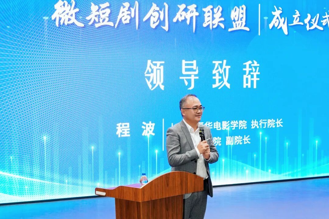 成立仪式上,上海温哥华电影学院执行院长程波在致辞中表示,联盟的成立不仅是一个仪式,更是一个“由虚入实”的产业实践开端。他指出,在当前视听技术变革的时代背景下,温影将充分发挥联盟的平台价值,通过深度融合行业资源,在内容创作、技术应用和人才培养等多个维度推动微短剧领域的实践创新。程院长特别提出,微短剧创研联盟的成立是对温影办学基因的深度延伸,其与学院在2024年成立的“AI未来影像创研中心”形成战略协同,共同构建学院面向未来的发展格局。他期待通过与业界的紧密合作,共同培育具备创新视野和实战能力的专业人才,助力影视视听行业实现高质量发展。