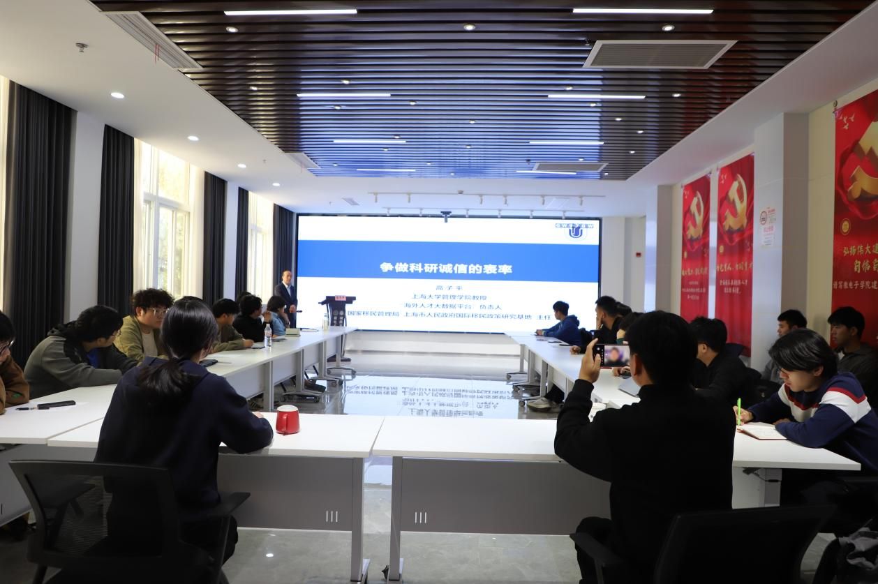 首先,上海市科研诚信宣讲团专家、365完美体育管理学院高子平教授高子平为新教师带来了为题《争做科研诚信的表率》的专题报告。高教授从科研强国“初心”谈学术诚信的重要意义,结合国内外典型案例阐释违反科研诚信的具体表现,并结合生成式人工智能在科研数据处理、论文撰写、课堂教学等场景中的使用边界与伦理规范,引导新教师们以负责任的态度利用技术赋能,而非被技术所困,为维护风清气正的学术生态奠定了坚实的思想基础。
