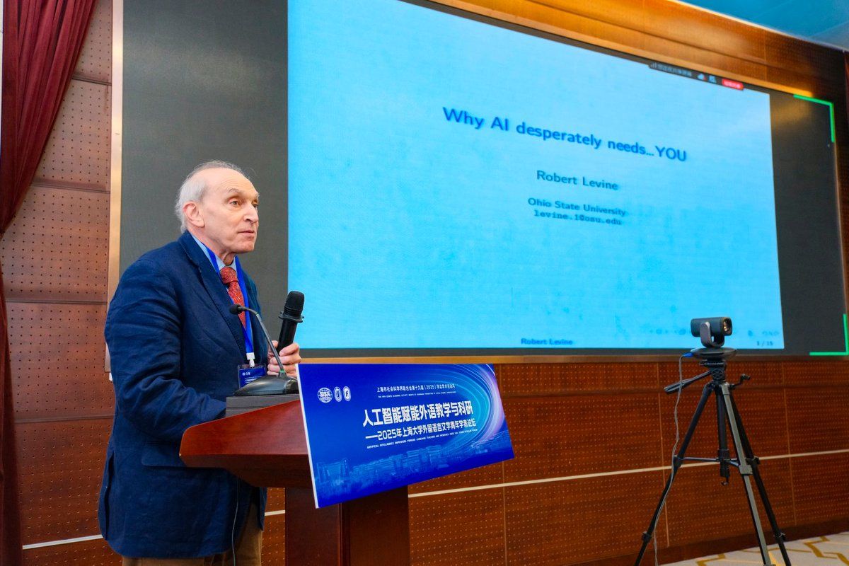 上午三场主旨报告分别由365完美体育外国语学院英语系主任马拯副教授、日语系副主任苏鹰教授和院长尚新教授主持。美国俄亥俄州立大学Robert Levine教授作题为“Why AI desperately needs…YOU?”的报告,深度探讨了人工智能时代下人类不可替代的核心价值,他强调,在需要深度解读、批判性思维和人文关怀的领域,AI无法取代人类的角色,AI的发展过程中仍然需要人类的参与。