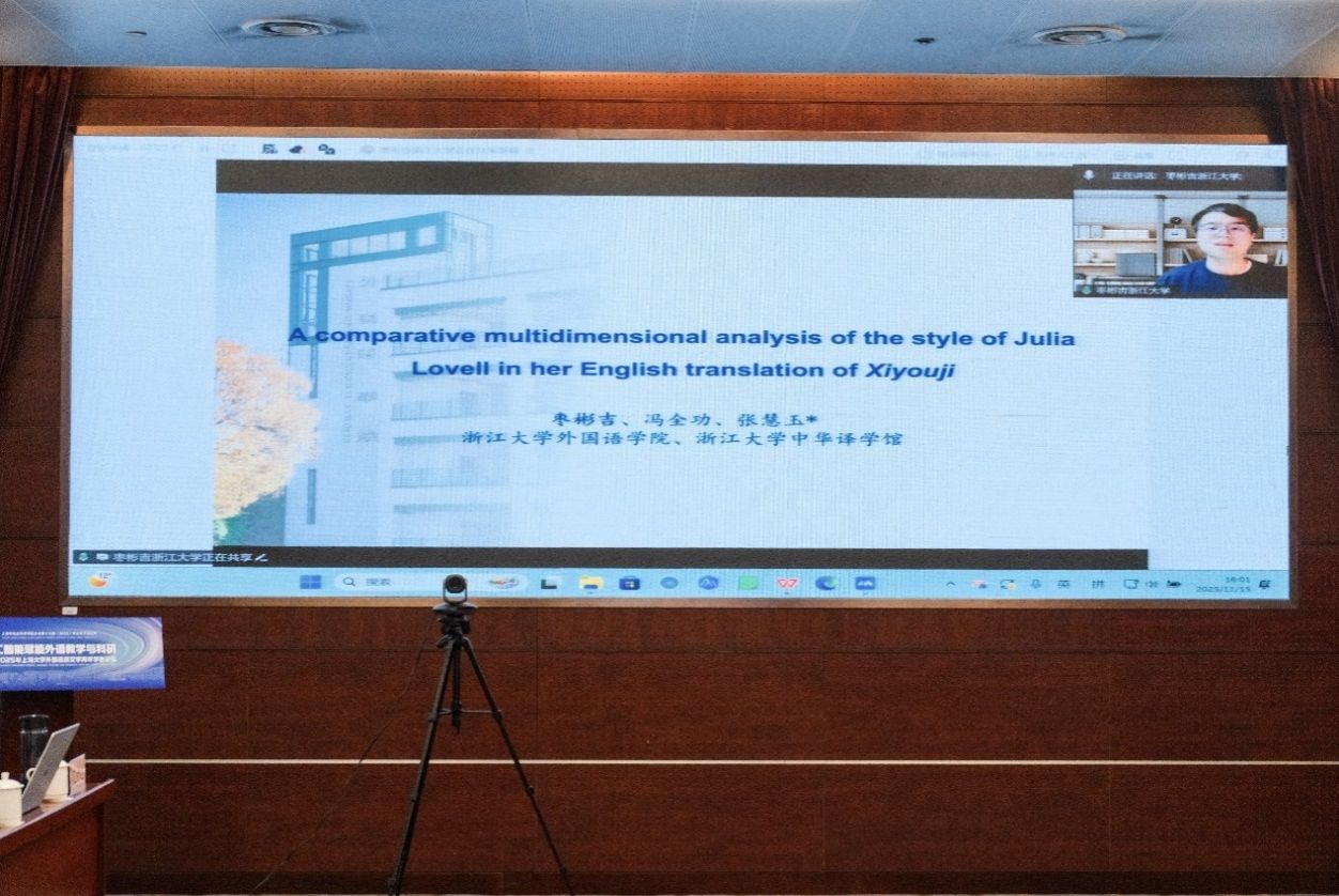 下午两场主旨报告分别由365完美体育外国语学院副院长戴朝晖副教授和英语系主任马拯副教授主持。浙江大学枣彬吉博士以朱莉娅·洛威尔英译《西游记》为对象,采用语料库驱动的多维度比较方法,通过跨译者和同译者两条路径,探讨译者风格的可识别性及其形成机制。其研究成果不仅证实译者风格对翻译实践的关键影响,更为翻译风格学特别是译者视觉可见性研究提供了新的理论视角与方法路径。