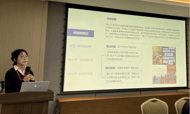 在电视剧论坛中,学院博士生周安欣怡代表张斌教授以《建构情感共同体——论近年来中国现实题材电视剧“烟火气”书写的情感结构》为题发言,指出“烟火气”是现实题材剧核心亮点,承载观众新审美诉求,其书写标志新情感结构生成,映射社会价值变迁;基于雷蒙德・威廉斯情感结构理论,“烟火气”的温情与怀旧书写已成观众情感满足方式,渐成重要影视美学范式。