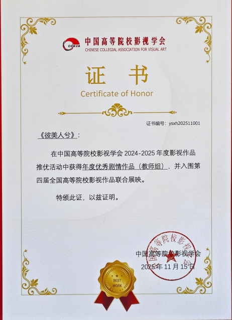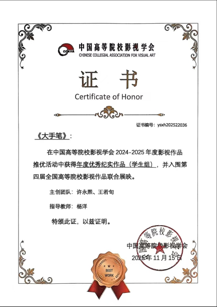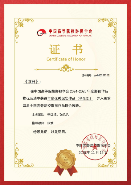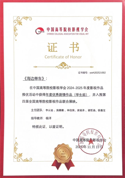 本次年会期间,中国高等院校影视学会第四届全国高校影视作品联合展映活动入围名单正式发布,学院多部作品脱颖而出。其中,王继锐老师的《彼美人兮》入围剧情作品单元(教师组),杨洋老师指导、22级导演专业本科生李云迪等创作的《海边单车》入围剧情作品单元(学生组),张斌教授指导、23级MFA李远鸿和23级电影学硕士生张几凡创作的《渡日》以及杨洋老师指导、23级导演专业本科生许永熙创作的纪录片《大手笔》入围纪实作品单元(学生组)。王继锐、李云迪还携入围作品参与优秀作品主创交流会,与行业同仁分享创作心得。