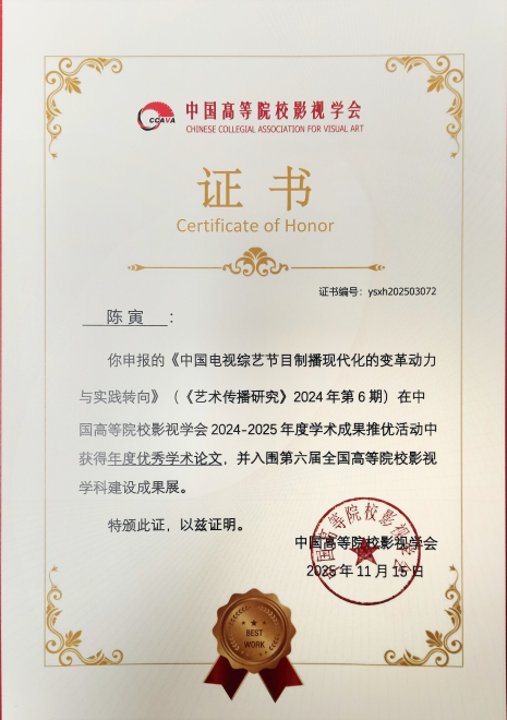 在第六届全国高校影视学科建设成果展中,学院陈寅讲师的论文《中国电视综艺节目制播现代化的变革动力与实践转向》入围年度学术论文。该文发表于CSSCI扩展版期刊《艺术传播研究》2024年第6期,认为中国电视综艺领域的市场化、产业化进程,有力促进了此类节目制播理念、生产方式和运营模式的革新,在这一领域先后推动了五次鲜明的转向与制播的进阶——可以概括为国际化、娱乐化、商品化、产业化、本土化,从而积累了推进中国式电视综艺节目制播现代化的基本经验,进而为该领域探索出一条中国式现代化的新路。
