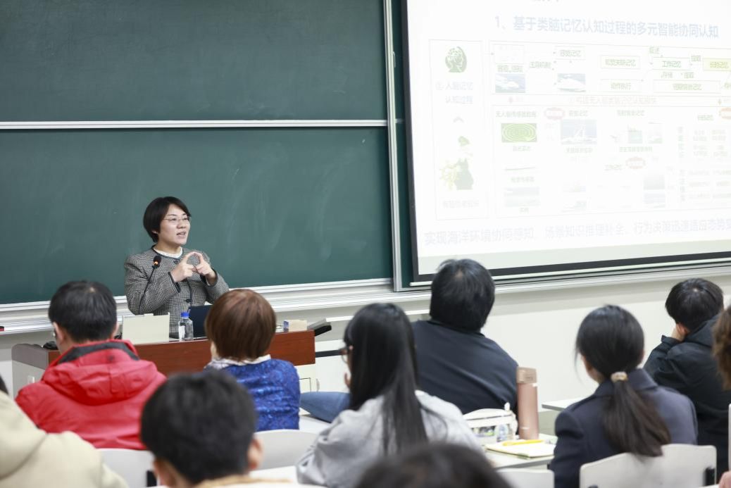 “今年的九三阅兵大国重器、顶级装备鱼贯而过,非常提振士气,鼓舞人心。让人感到惊喜的是海上无人作战方队,这个方队受阅的新型无人潜航器、无人艇、无人布雷系统,是海上作战的‘奇兵利器’”。在海上无人装备领域已积累16年研究经验,承担了国家自然科学基金重大项目、创新研究群体项目的谢少荣教授结合阅兵式开讲了。这段开场白,充满自豪。目前谢老师主要从事海洋船舶自主智能无人集群、类脑机器认知学习等研究。她带领团队研制的精海系列无人艇已应用于南海东海岛礁探测,曾经获得国家技术发明二等奖,2024年获首届ACM China杰出学者奖。她分享了如何通过“多元智能协同认知”“递进式策略学习”“虚实迁移学习方法”三大核心技术,破解无人艇集群向自主博弈对抗的群体协同跨越的难题。她勉励年轻大学生,“人工智能是年轻人的事业,无人艇作为人工智能新兴技术的重要体现,正成为国家海洋战略的重要支撑。”