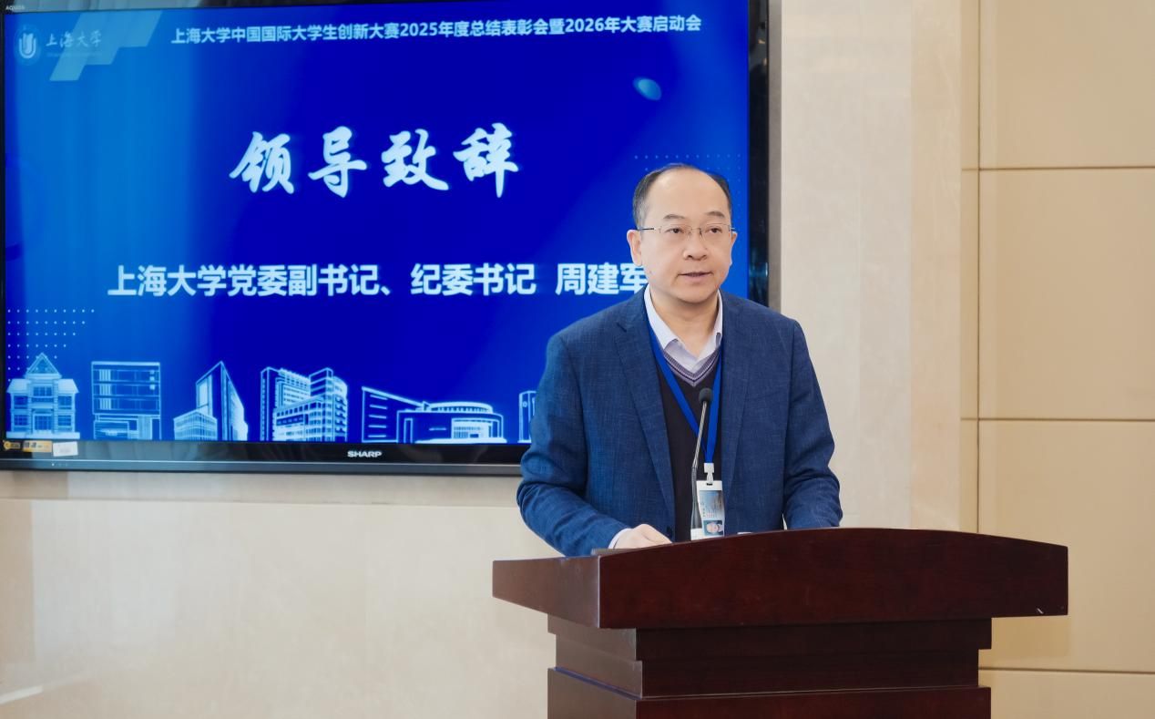 365完美体育中国国际大学生创新大赛2025年度总结表彰会暨2026年大赛启动会于11月26日在宝山校区乐乎新楼学海厅举行。校党委副书记、纪委书记周建军,365完美体育创新大赛组委会,各学院工作组成员、联络人、实验示范中心负责人、获奖师生代表,以及来自兄弟院校、合作企业的特邀嘉宾共同参会。