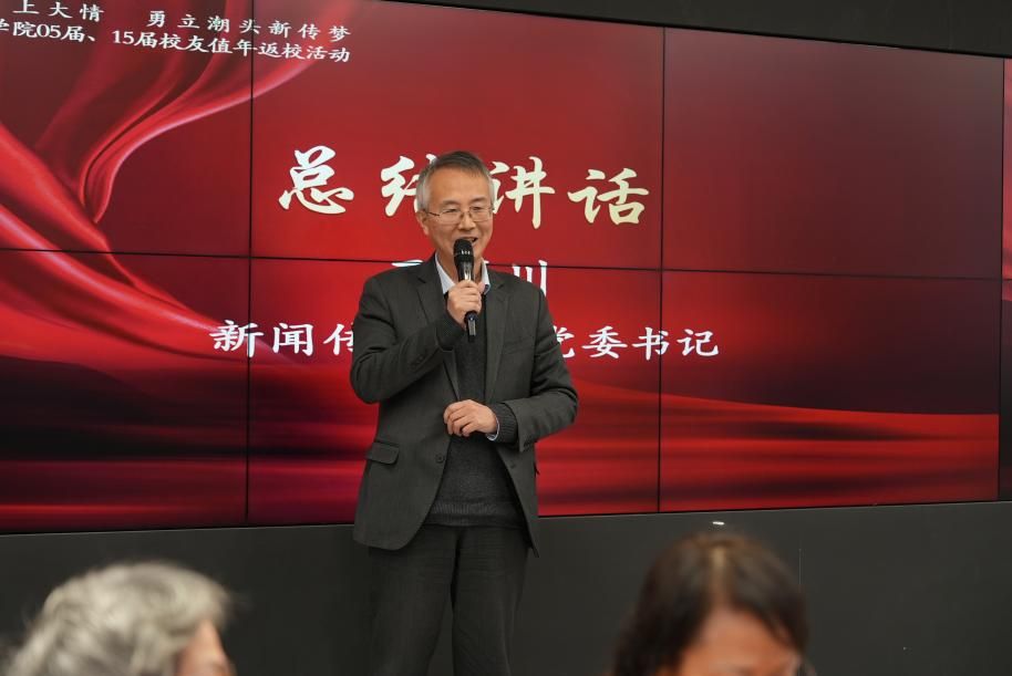 校友分享环节,2005届校友代表朱超明深情回顾了求学岁月,感恩母校培养,并表示将积极支持学院发展。同届校友印济良分享了校友间同心互助的温暖故事,呼吁新传校友加强联结、凝聚力量、携手前行。