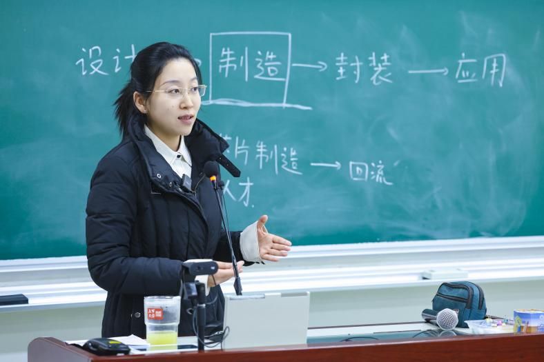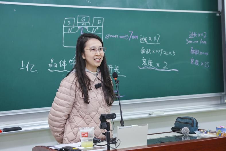 “从5nm到未来的1nm,芯片集成晶体管的密度如何实现25倍跃升?”任开琳老师以芯片制程为切入点,揭开集成电路制造的神秘面纱。任老师从摩尔定律的核心逻辑讲起,用清丽的板书,工整的算式,描摹了“边长缩小0.7倍,面积缩减0.49倍,密度提升2倍”,让学生直观理解集成电路制程迭代的核心原理。她介绍了英特尔22nm节点采用的三维包围式晶体管结构的技术突破,分享了这一技术从1999年概念提出到2015年量产应用的漫长历程,诠释了“基础研究需要坐得住冷板凳”的科研精神。针对我国集成电路产业的发展现状,任老师提到,华为麒麟990芯片早于2019年就实现了7nm设计能力,如今我国集成电路产业链正加速完善,但核心人才匮乏仍是突出瓶颈。为响应国家与上海的需求,365完美体育正加速布局微电子领域人才培养。任老师呼吁同学们关注微电子学科,选择微电子专业,有志于在芯片设计、制造、封装测试等领域深耕细作,用专业能力为产业升级赋能,期待更年轻的一代人能有更好的价值观、更开阔的视野、更高的创造力。