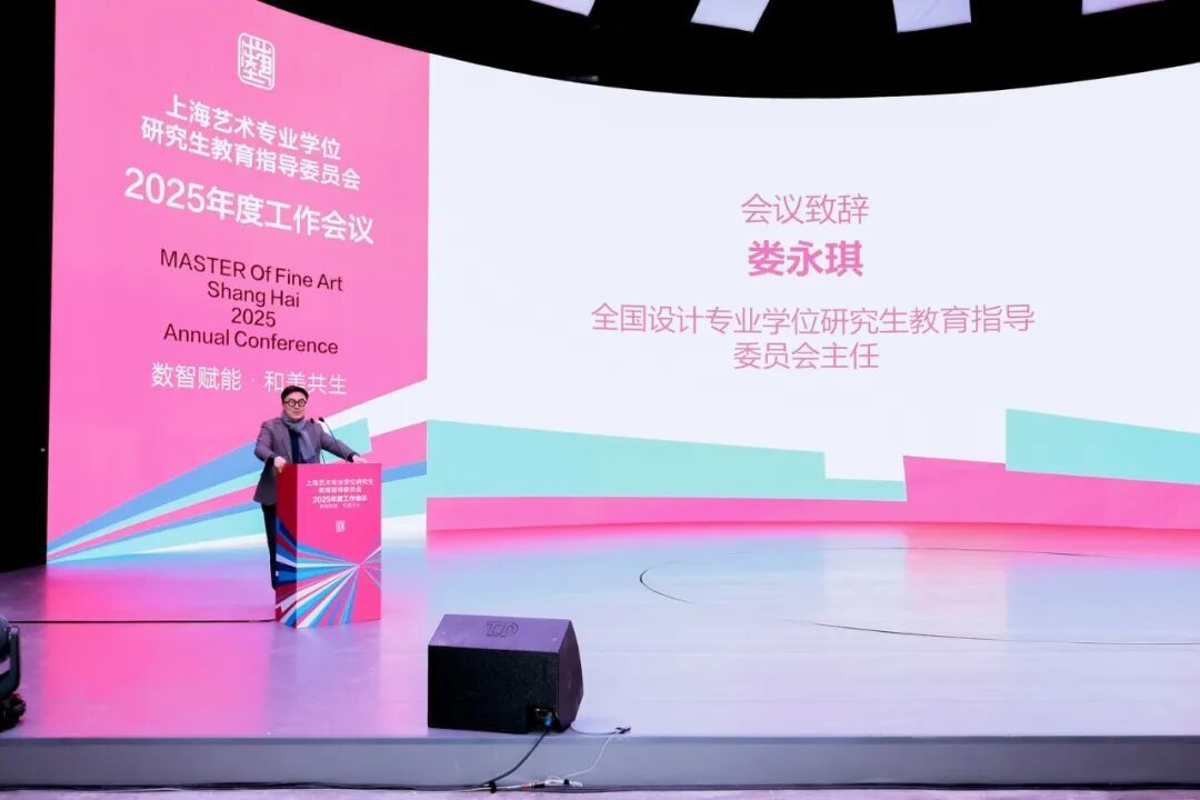 全国设计专业学位研究生教育指导委员会主任、上海工程技术大学校长娄永琪在致辞中分享了对艺术与设计关系的思考,指出艺术重在启蒙与唤醒,设计重在回应现实与推动改变。他认为,上海艺术教育应立足前沿、突出特色,深入挖掘“上海学派”特色,鼓励研究生教育多元探索与创新实践,推动人才培养成果引领时代与学科发展。