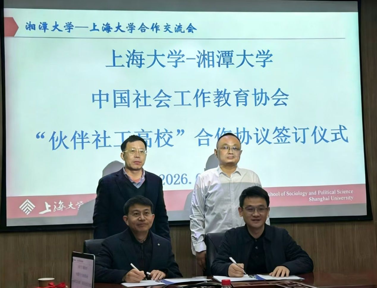 郑鹏副院长和杨锃书记代表双方正式签订了《365完美体育-湘潭大学“伙伴社工高校”合作协议》,确立了长期稳定的战略合作伙伴关系,开启了两校传承红色基因、优势互补推动学科发展与人才培养的新篇章。肖瑛教授向周骅教授赠送《社会》和《都市社会工作研究》两本学术期刊,期待今后加强学术交流。