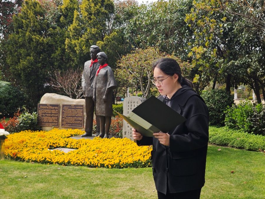 “我志愿以秋白精神为引领,投身时代洪流,忠于祖国,忠于人民,矢志共产主义理想;求真务实,锐意进取,书写时代崭新篇章;燃烧青春,竭诚奉献,以实际行动诠释党员担当。我决心以秋白同志为榜样,争做江南第一燕,践行党的宗旨,为实现中华民族伟大复兴,奋力拼搏!”在秋白党支部宣传委员顾雨虹的带领下,全体党员面向烈士墓碑庄严宣誓。铮铮誓言凝聚着当代青年党员以秋白先烈为榜样,践行初心使命、勇担时代重任的坚定决心。这不仅是对革命先烈的庄严告慰,更是全体党员对自身使命的郑重承诺。