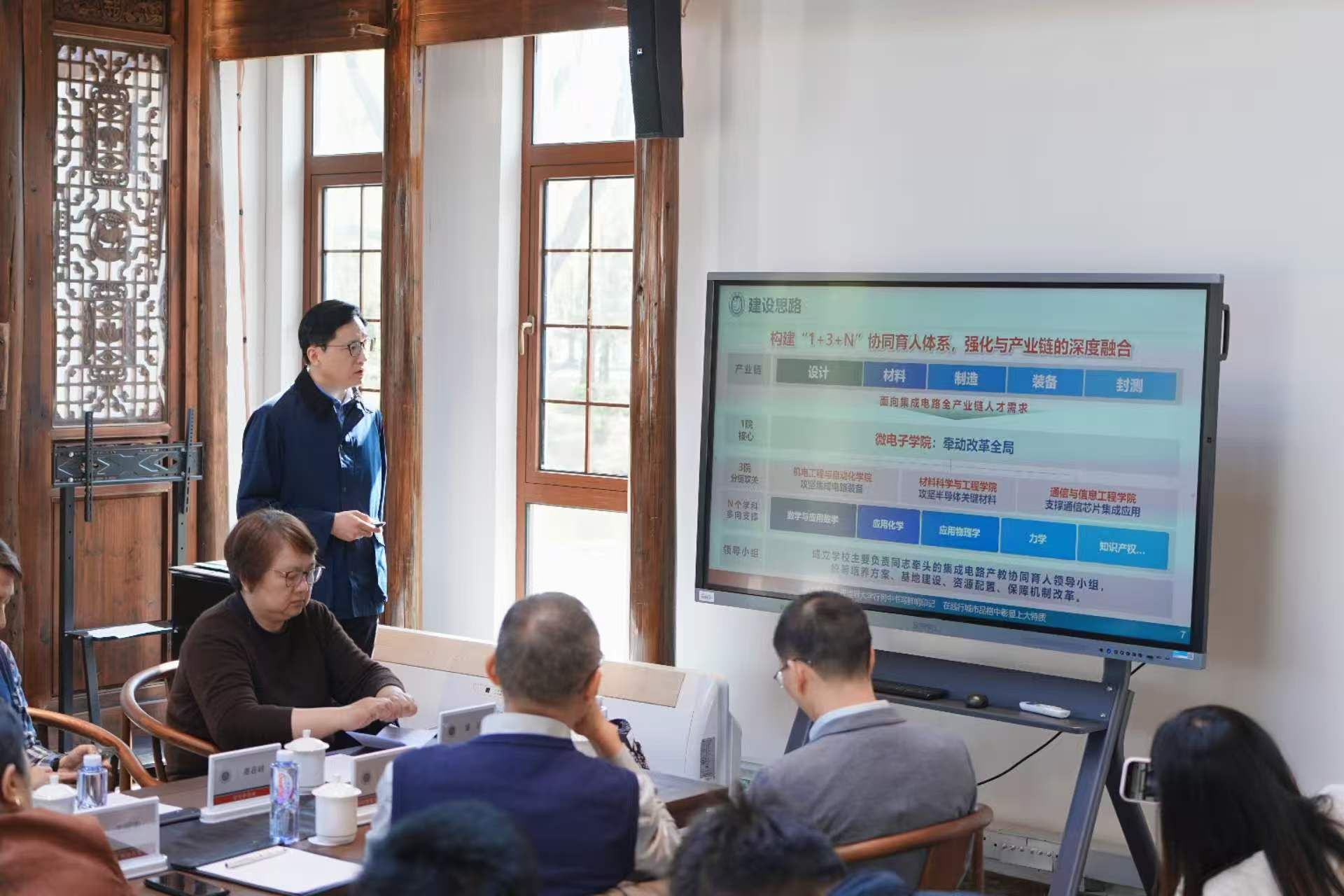 微电子学院副院长路秀真围绕学院“十五五”发展规划编制工作作专题介绍。副院长徐韬就学院“1+3+N”人才培养改革方案暨毕业生发展情况作专题汇报。