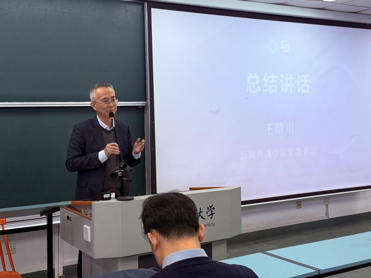 活动最后,王晴川书记在总结讲话中强调,新闻传播学院办学特色鲜明、优势显著,可归结为“体制双共建、育人重实践、紧跟智媒体、突出马新观”。他指出,学院资源丰富、前景广阔、未来可期,各类实践项目、品牌活动亮点纷呈,积极为同学们搭建优质成长平台。他热忱邀请在场同学加入这个充满活力的大家庭,在未来的学习生活中共同“追逐光、靠近光、成为光、散发光”。