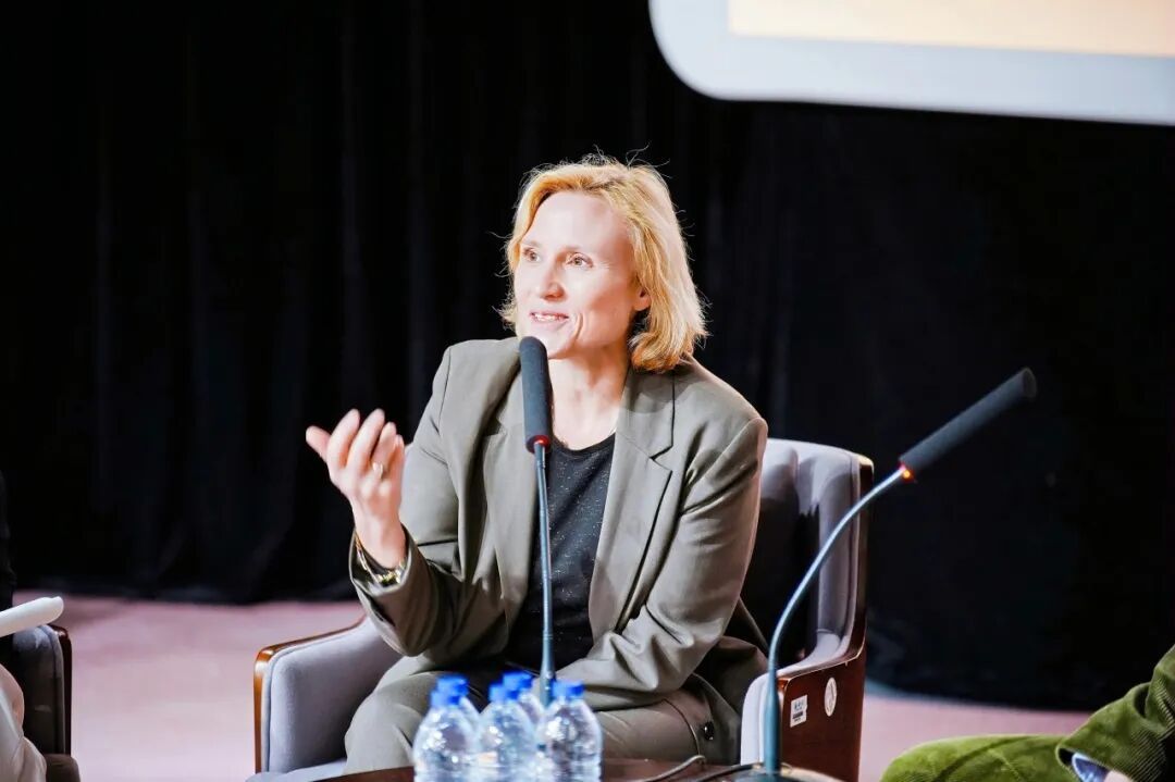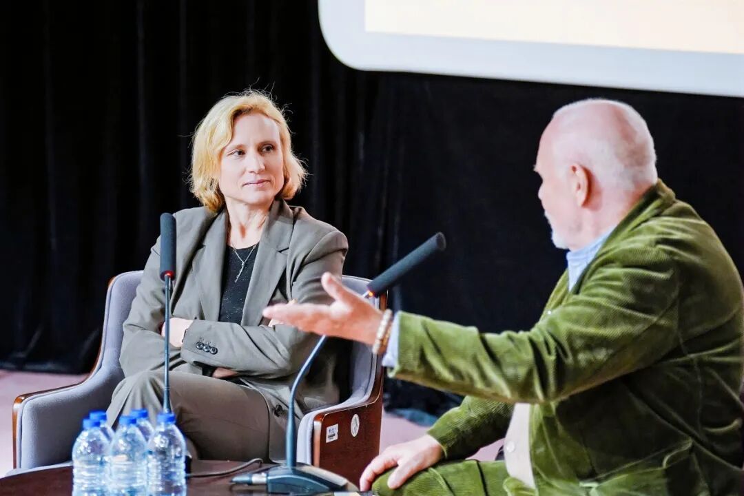 随后,马可穆勒教授与唐莉安女士以其职业选择为切入点展开对谈,唐莉安女士结合自身从业经历,分享了纪录片海外发行、近年法国影视市场审美趋势、法国电影行业及合拍片运作机制,并畅谈了对当下 AI 冲击电影行业的见解。