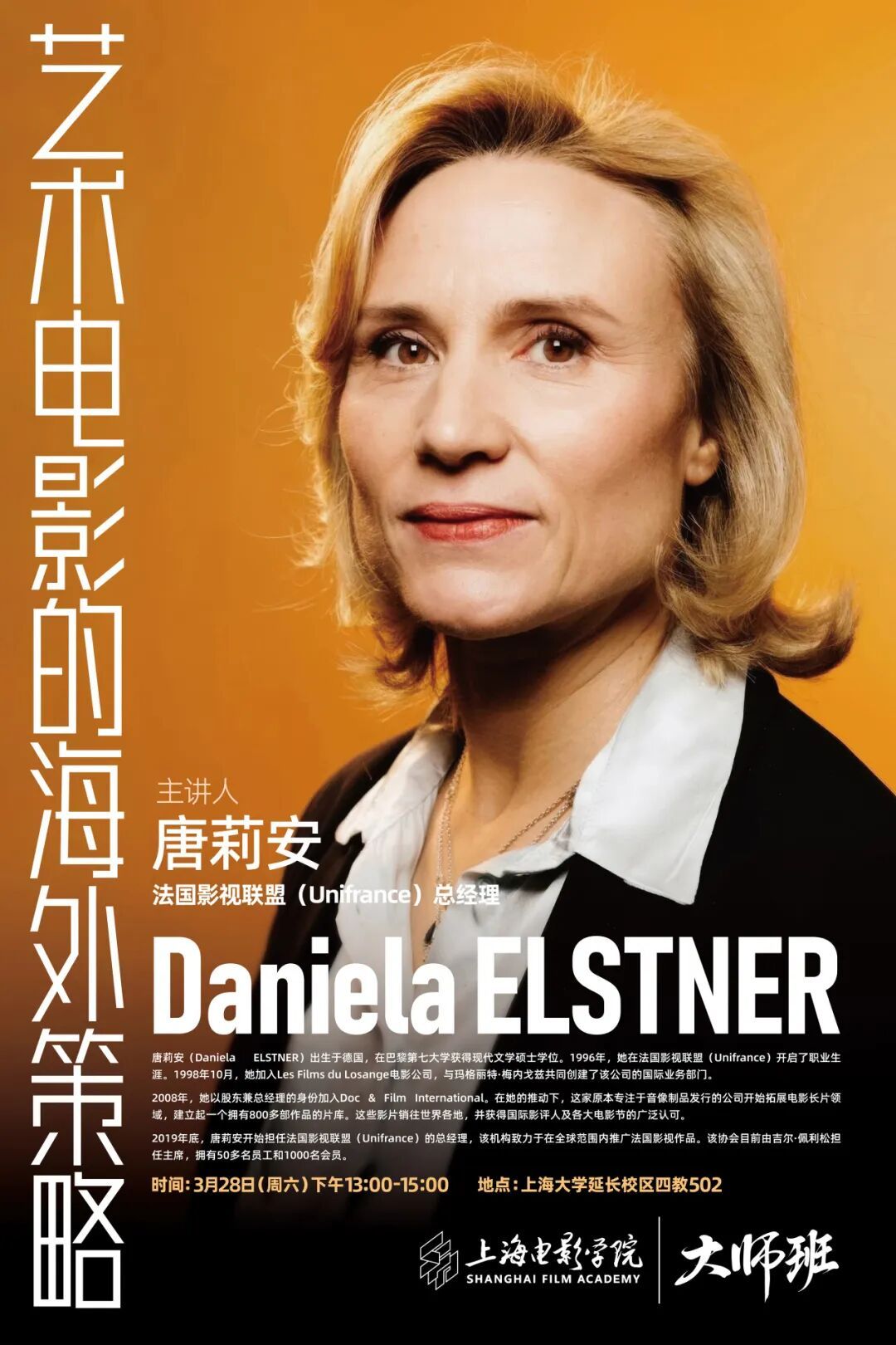 3月28日,上海电影学院特邀法国影视联盟(Unifrance)总经理唐莉安(Daniela ELSTNER)女士一行,参观学院基础教学建设,提出建议,并为在校师生带来专题讲座,深度解析华语电影如何迈向国际,精准布局海外奖项与营销策略。