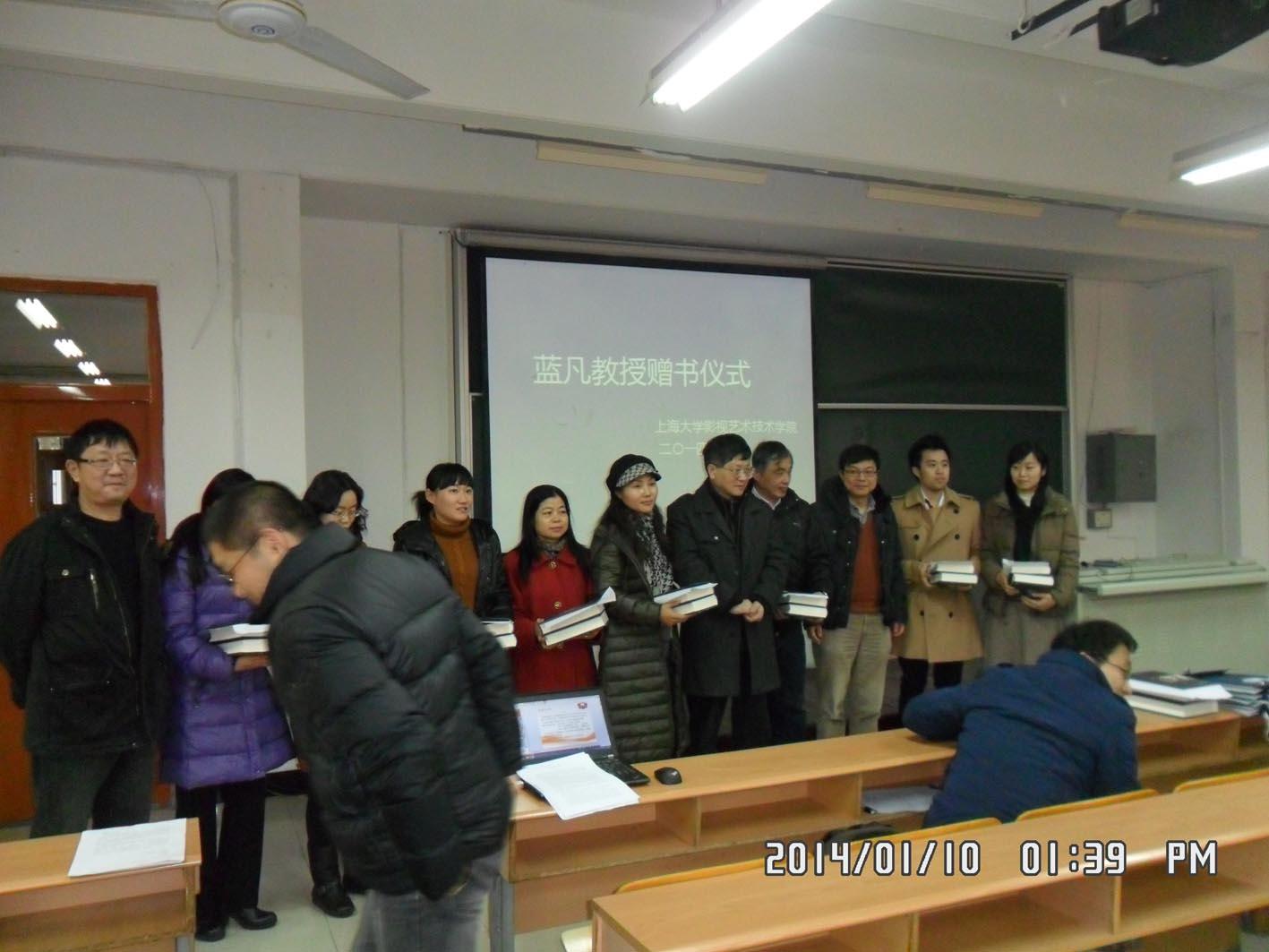 (影通社讯 记者 路少伟 摄影 蒋安)1月10日下午1时30分,影视学院蓝凡教授授书仪式在一教220室举行。这两本巨著本应在三年前发布,无奈毁于静安区胶州路大火这场事故中。蓝凡教授表示,之所以举行授书仪式,是为了表达对各位老师在火灾后对他的关怀和爱心捐助。        蓝凡教授在赠书仪式上未语凝噎,情绪有些激动,在五分钟的发言中,他提到三年前胶州路发生的火灾,家中近五万册的珍贵藏书化为灰烬,数十年的艰辛创作付之一炬。当时自己特别的痛心,几乎失去创作的勇气。幸而火灾发生后,学院老师和社会爱心人士对蓝老师的鼓励和帮助让他重新开启了自己的艺术创作。蓝凡教授说:“如果没有各位老师的鼓励及爱心,我不可能再有毅力重新完成《电影论:对电影学的整体思考》这部著作。”蓝凡教授带着这些关爱,三年来上下班都是用行李箱拖着研究资料来往家校,苦心撰写,挑灯奋战,毅然完成了自己的学术著作。蓝凡教授在每一部赠书的首页都附了一封感谢信:非常感谢您在我遭受火灾后,对我的帮助与精神上的支持!这也是我重新撰写《电影论——对电影学的总体思考(上、下)》的艺术动力之一。郑重表达对各位老师的感谢和祝福。